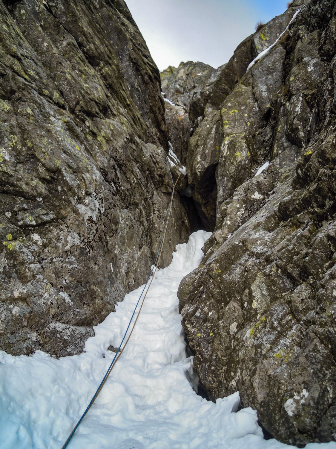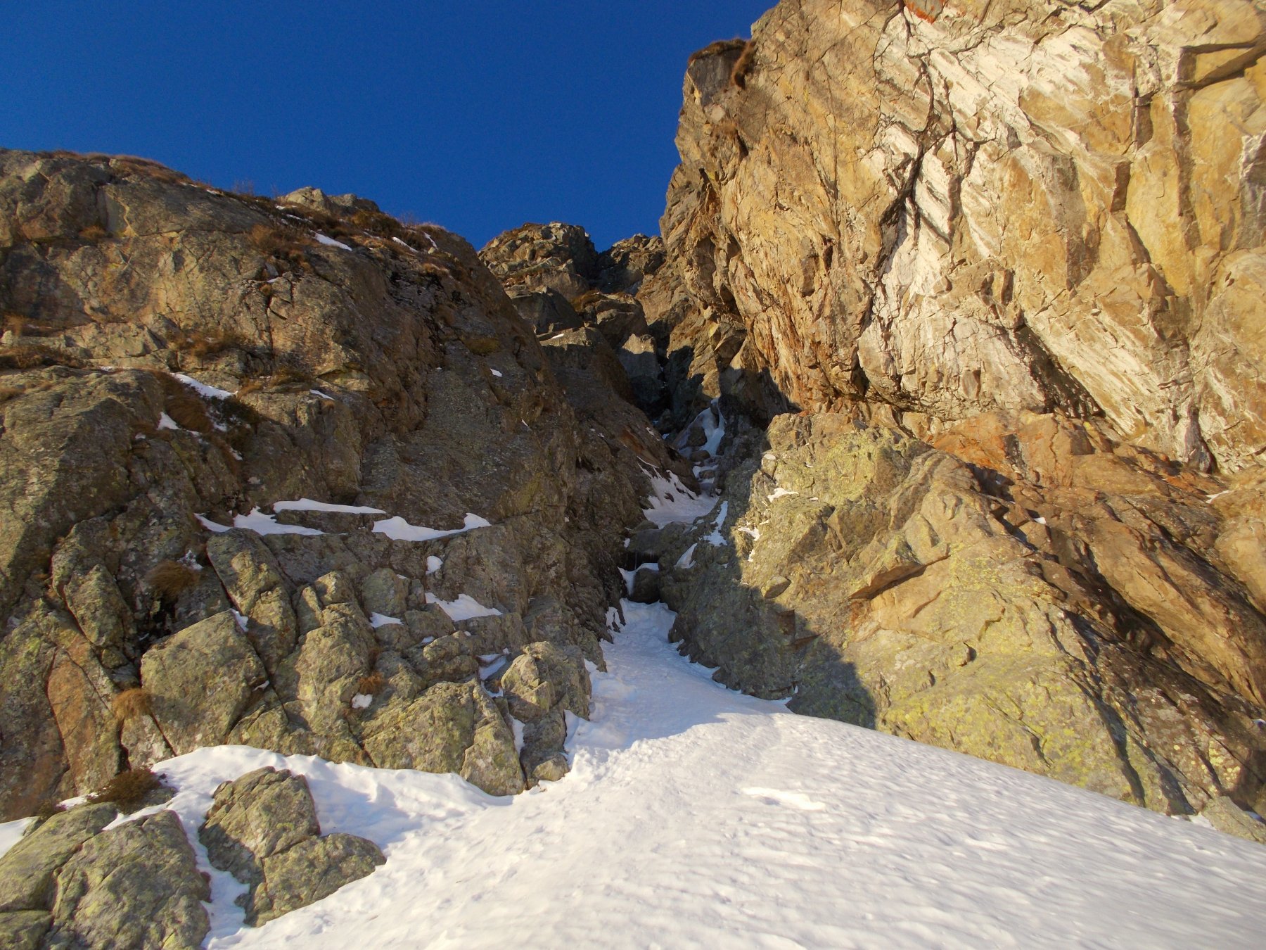 - L1, M4, neve 40°-50°, 50 metri: salire il conoide di neve fino all’inizio del canale, che presenta subito un saltino verticale-strapiombante formato da grossi blocchi incastrati, protetto con fix. Continuare più facilmente per zona più abbattuta, fino alla sosta a destra.
