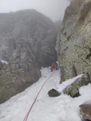 - L7, M4, neve 40°, 50 metri: su per tratto in roccia verso sinistra e poi dritto per diedrino, che porta a destra ad una zona meno impegnativa. Si prosegue su neve verso sinistra, fino alla sosta su grosso masso.