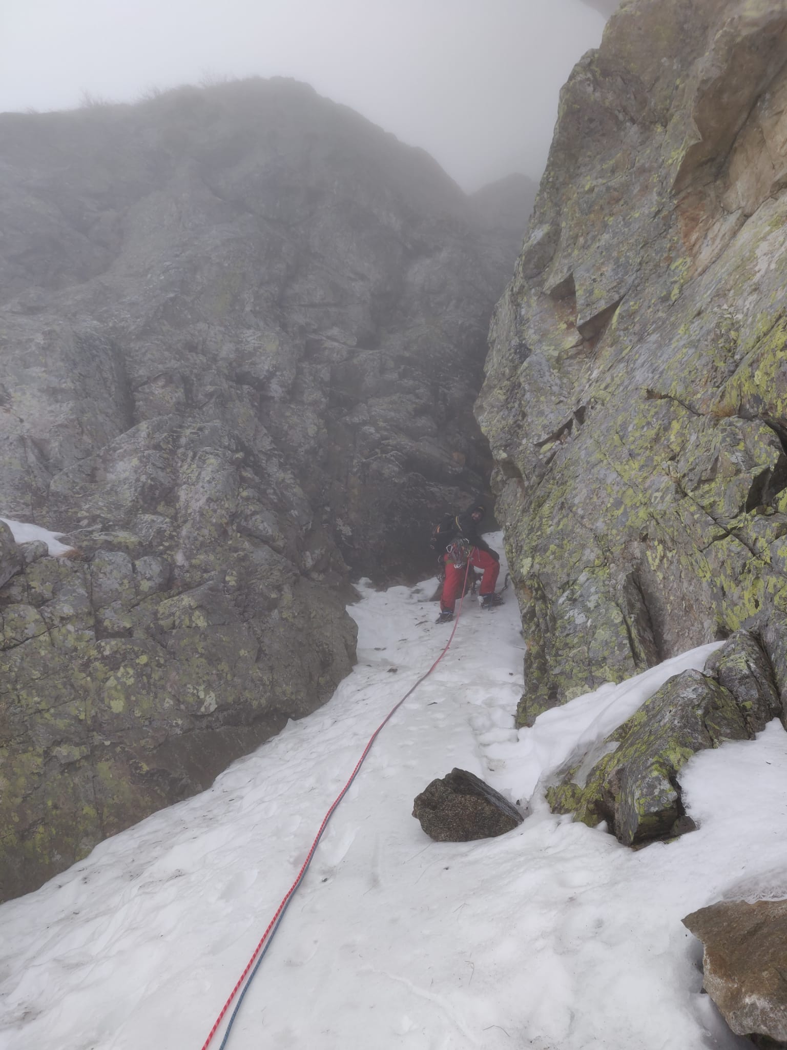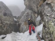 - L2, passi M4, neve 50°, 30 metri: proseguire nel canale, fino ad un paio di brevi tratti delicati in roccia, arrivando alla sosta alla destra di una placca.