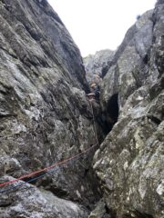 L’ultima sosta è dietro un masso appena usciti dall’ultimo tiro, non è visibilissima, ma c’è. Bisogna uscire verso sinistra.