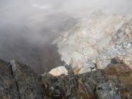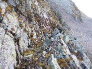 Roccette accatastate con misto terra-erba, si scende comunque bene fino all’ingresso del canale che collega direttamente alle giavine del passo dov’ è necessario muoversi con prudenza su alcune ripide placche.