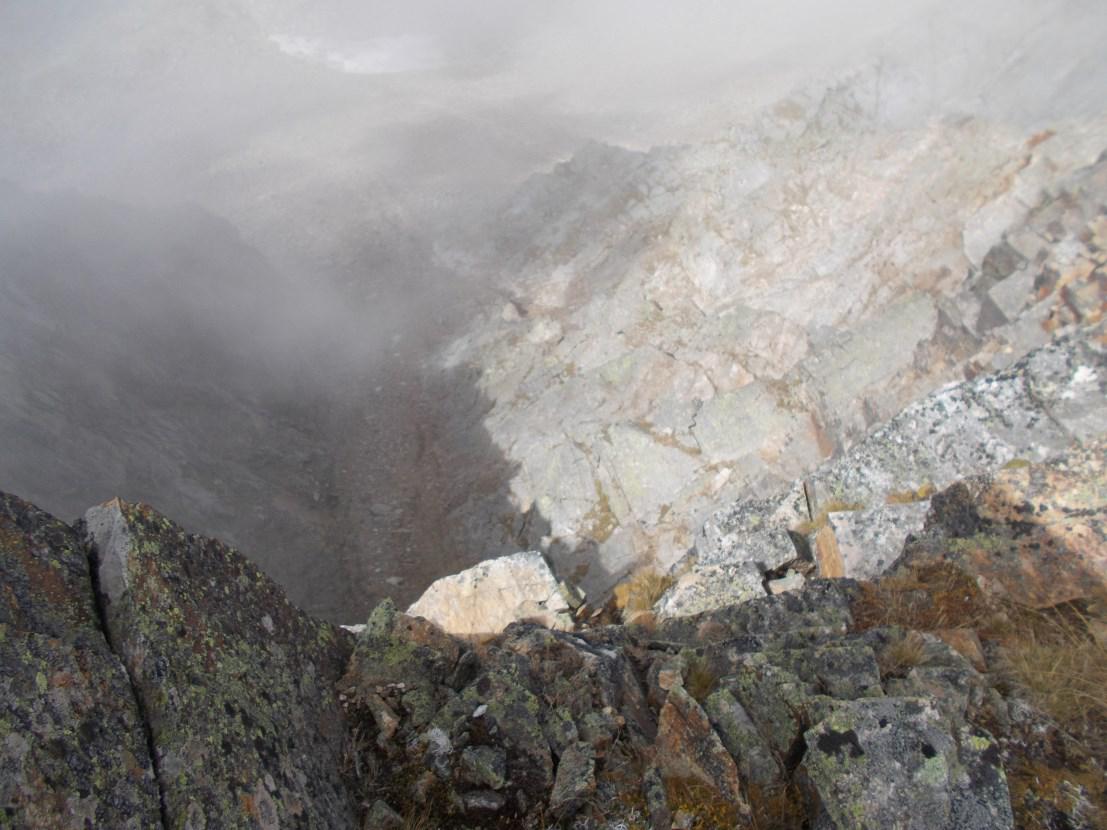Dal Corno Mud (croce mt 2802), seguendo ancora in parte la cresta, si accede alla ripida parete N che conduce al Colle Piglimò.