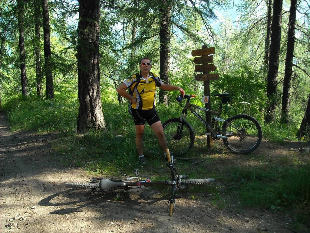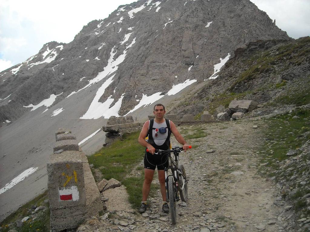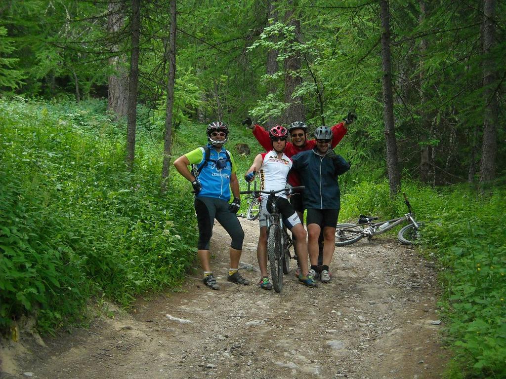 Sono le nove. Si parte, siamo: Andrea, Carlo, Gabriele, Paolo ed io. Prendiamo il sentiero che porta al pian del sole, ma al bivio per pian del sole tiriamo dritti per P.ta Colomion, la salita è abbastanza impegnativa e si guadagna quota velocemente, c’è un caldo umido che rende pesante la respirazione e si suda il doppio, Andrea e Gabriele “pesi super leggeri” ci hanno abbandonato quasi subito, io procedo piano aspettando Carlo e Paolo che con il suo passo da equilibrista, arriva dappertutto. Così tra una foto e l’altra arriviamo a P.ta Colomion, dove c’è Andrea e Gabriele che ci aspettano, li facciamo una breve sosta, peccato che il bar è chiuso altrimenti una birretta ci stava bene. Riprendiamo la strada che ben presto ricomincia a salire, in alcuni tratti in modo sostenuto, in più il fondo non è dei migliori, arrivati al passo una breve sosta e ci prepariamo per la discesa, che si rivela bella e tecnica in alcuni tratti, Naturalmente io, Andrea e Gabriele ci buttiamo giù a manetta, ogni tanto mi fermo ad aspettare Carlo e Paolo, anche perché non si sa mai… E’ veramente una discesa interminabile, ATTENZIONE! a metà circa dopo una curva c’è delle piante cadute sul sentiero, noi per poco non ci sbattevamo contro. Ad un certo punto Andrea impreca e dice: ho forato! Quindi uno stop giusto il tempo di cambiare camera e via, in un attimo arriviamo giù a pian del colle, super soddisfatti, da lì riguadagniamo il piazzale del Melezet dove abbiamo lasciato l’auto. Un salutone ai compagni di pedalata: Andrea, Carlo, Gabriele e Paolo.