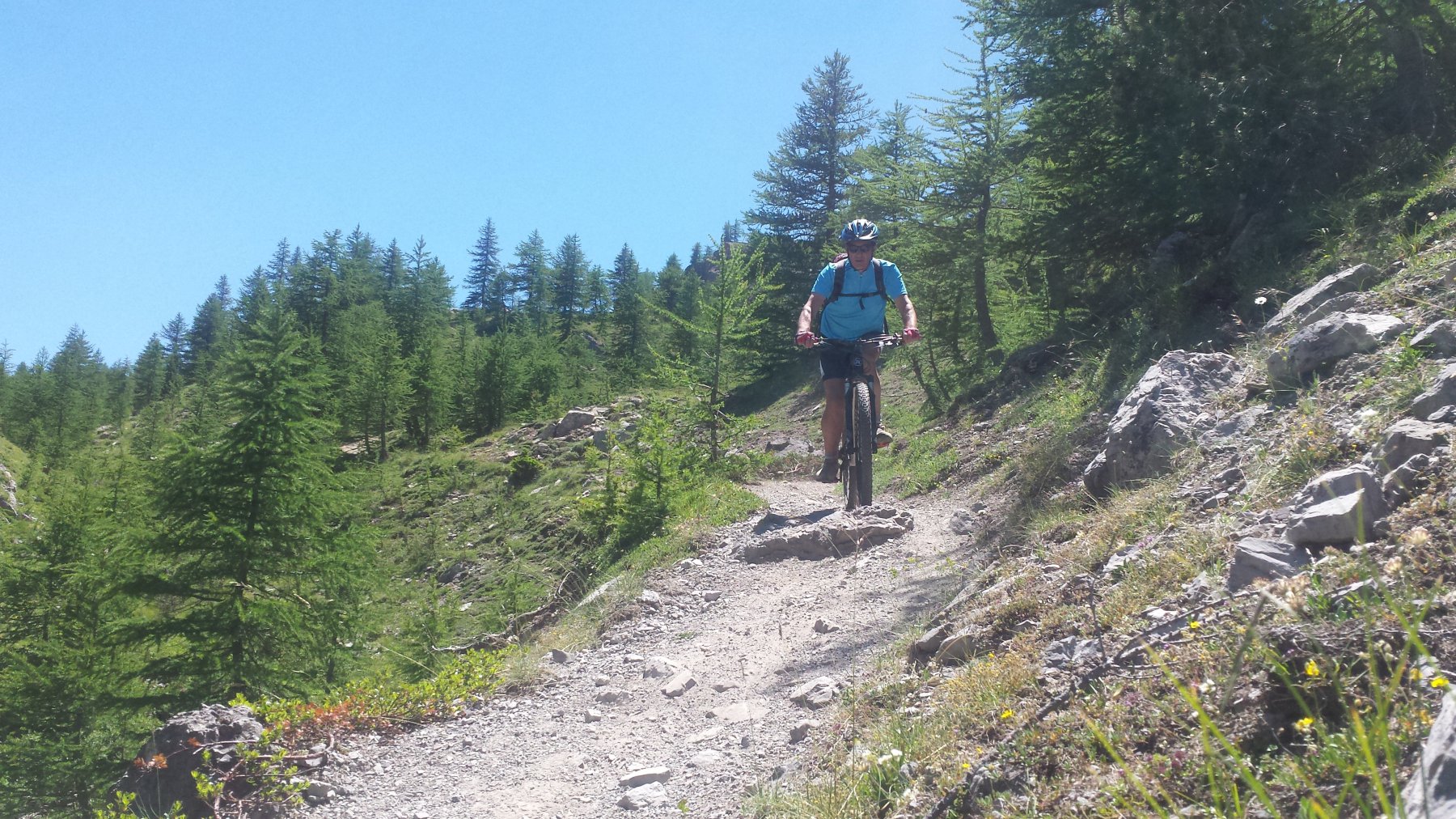Partenza da les Arnauld. Fino al Colomion si sale decisamente su bel fondo terroso e compatto, dopo fondo pietroso ed irregolare che obbliga, chi non è un “rampeur”, a scendere sovente dalla bici. In ogni modo tra una moto e l’altra siamo riusciti ad arrivare fino al colle. Discesa come da relazione, nell’insieme divertente fino a Chesal, da qui provata la pista DH … probabilmente divertente per chi sa mollare, io da quando, mio malgrado, ho scoperto l’uso dei freni queste cose non me le godo più.