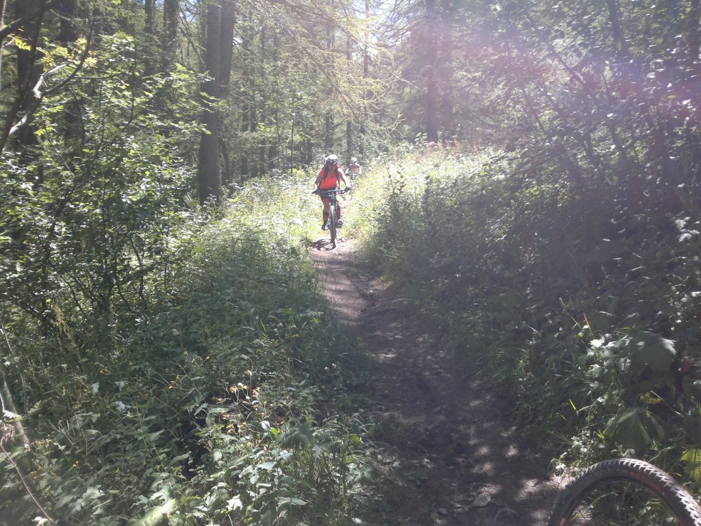 Partiti da Beaulard siamo saliti su bella e panoramica sterrata (in alcuni punti fondo abbastanza accidentato e pietroso) sino al passo della Mulattiera, passando affianco alla bella borgata di Puy. Da qui panorama bellissimo in una giornata relativamente fresca e nitida. Discesa veramente bella e divertente in single trek su sentieri super, in alcuni tratti abbastanza impegnativa. Dal Passo siamo scesi al col des Acles, da qui giù sino alla zona delle Grange Cros du Rey, e ancora giù sino a Melezet, sfruttando anche le belle piste di discesa appositamente preparate.Dopo una meritata bevuta di birrazze negli chalet affollati dalla civiltà(….), abbiamo proseguito sul bel sentiero che in falsopiano porta al forte di Bramafam e da qui proseguendo nella pineta, costeggiando la Dora sino a Beaulard. Gran bel giro in compagnia di una quindicina di bois e girls del Cai Bussoleno, dislivello circa 1400m per 37 km totali.