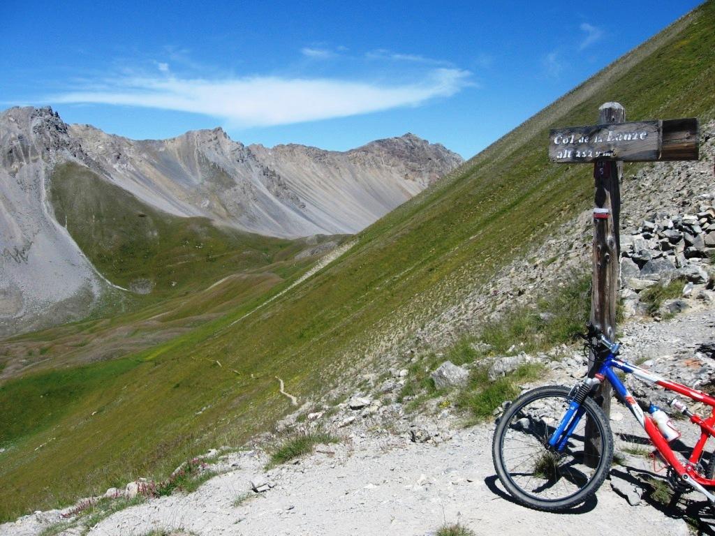 Poi vi butterete giu’ per i prati del vallone al di la’ del colle tenendovi a sx e raggiungerete le caserme in rovina del Col des Acles (2217), fontana; scendete in sella su sentiero a volte bruttino fino alla pietrosa sterrata che risalirete a sx fino alle Granges Acles (1879), dove, attraversato il rio su di un ex-ponte, andrete a sbattere il naso su una sterrata impossibile da pedalare, quindi la farete 80% a piedi; finita la sterrata un sentiero anch’esso impossibile vi porta in breve ad un silente pianoro, che pedalerete per alcuni minuti, scenderete mezzora, salirete qualche minuto vicino ad un lago asciutto da secoli, sopra il quale sta un larice solo da secoli ed arriverete distrutti al Col de Dormillouse (2445m, non un centimetro in più, né uno in meno del Colle di Valle Stretta di ieri) e , con un piacevole traverso pedalabile con attenzione, sarete al mitico Col de Lauze (2526).
