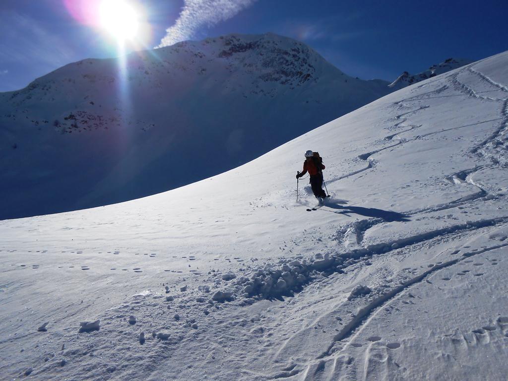 Discesa dal colle su bella farina, appena un pò pressata. Scesi poi nel vallone alla dx. orografica per sfruttare il pendio invitante, quindi ripellato a guadagnare la traccia per ridiscendere sul percorso di salita. Parte finale sulla stradina ad evitare sorprese.