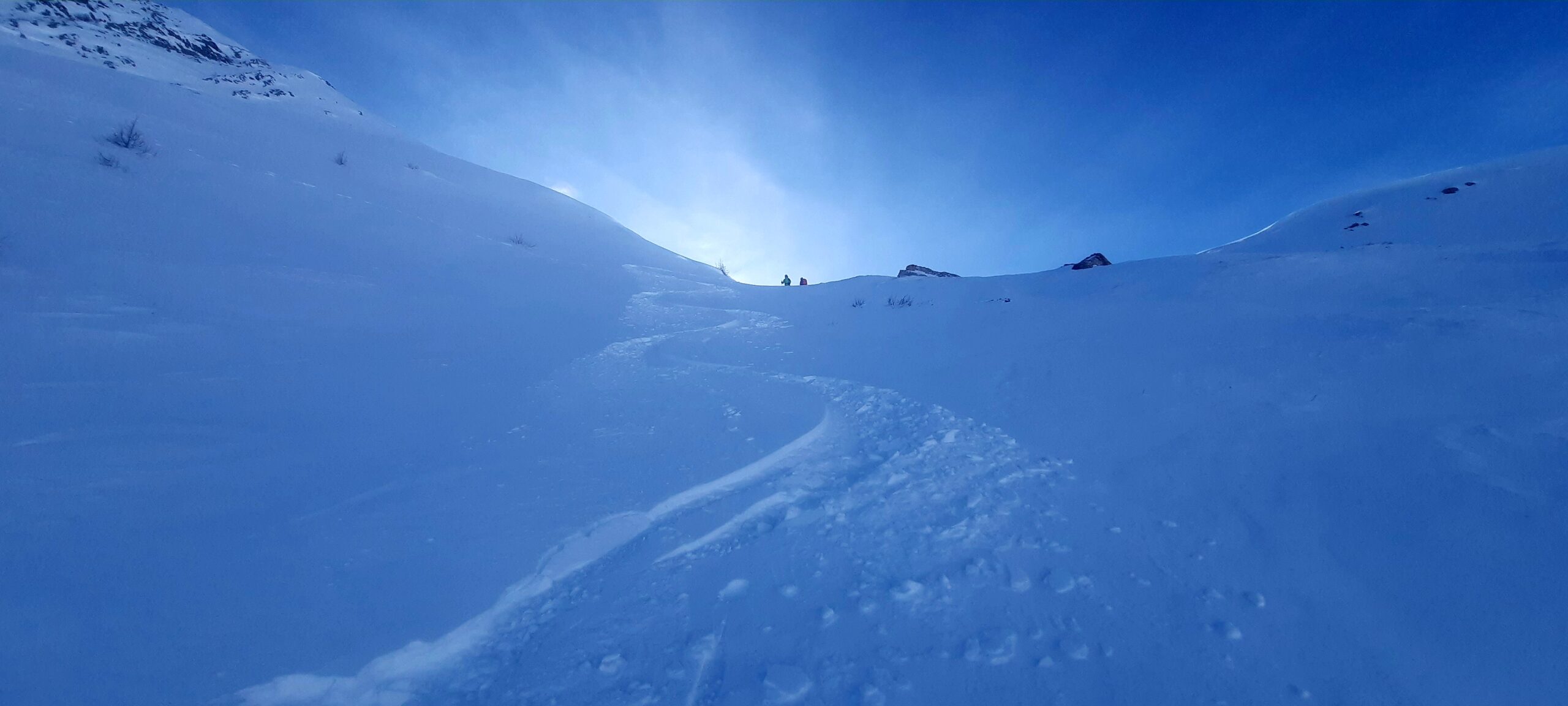 Percorso da tracciare nella parte bassa fino alla strada in arrivo da Chiappi da dove qualcuno era salito sia ieri che oggi. Poi di nuovo taccia da fare per uscire al colle.