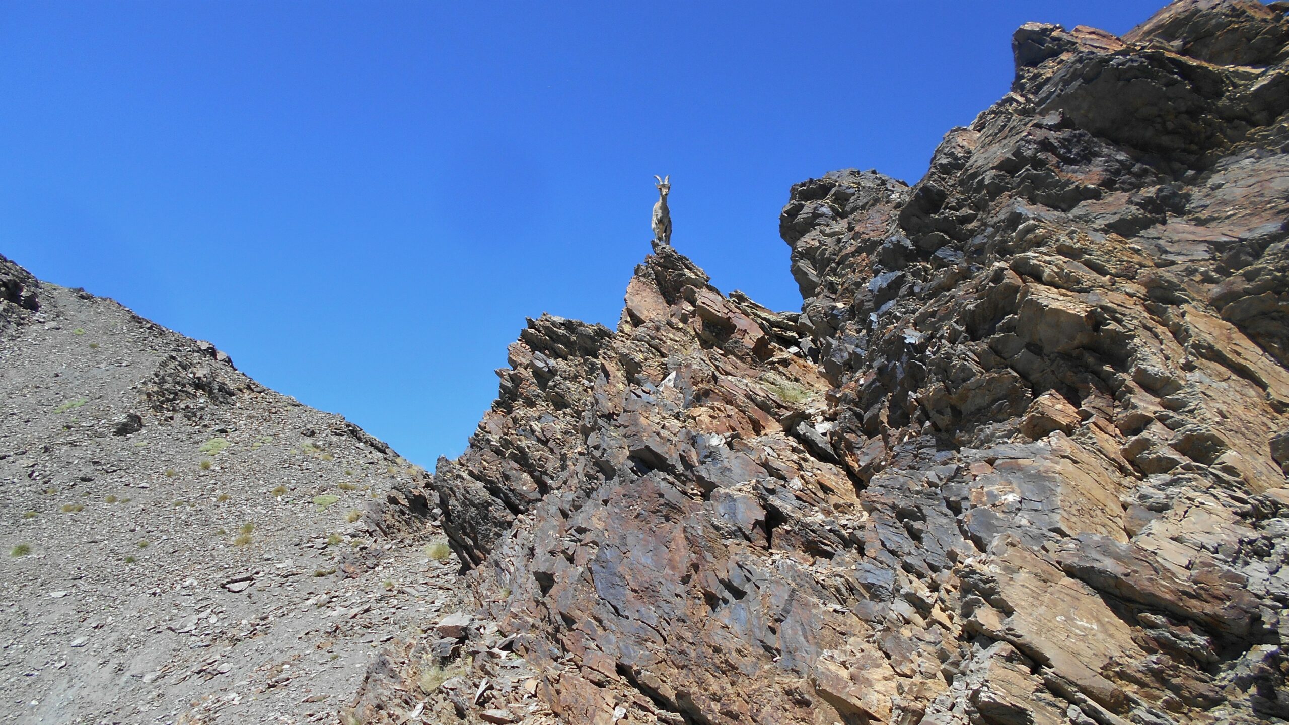 Partiti dal parcheggio a 2.500 m, non abbiamo salito il Veleta, ma puntato direttamente (si fa per dire…) al Mulhacen. Abbiamo evitato la cengetta, molto esposta (sono anche reduce da una frattura al braccio…), perdendo un po’ più di quota sulla stradina. Eterni i traversi sulla stradina, più bello l’ultimo tratto, con un colletto, la discesa verso il bivacco, passando sopra un laghetto, e la risalita della traccia sul ripido pendio finale, di oltre 400 m di dislivello. Al ritorno a circa 2.800 abbiamo utilizzato il taxi che stava passando di lì, risparmiandoci l’ultimo tratto…. Ho calcolato circa 1.500 m di dislivello positivo in totale e 28 km A/R