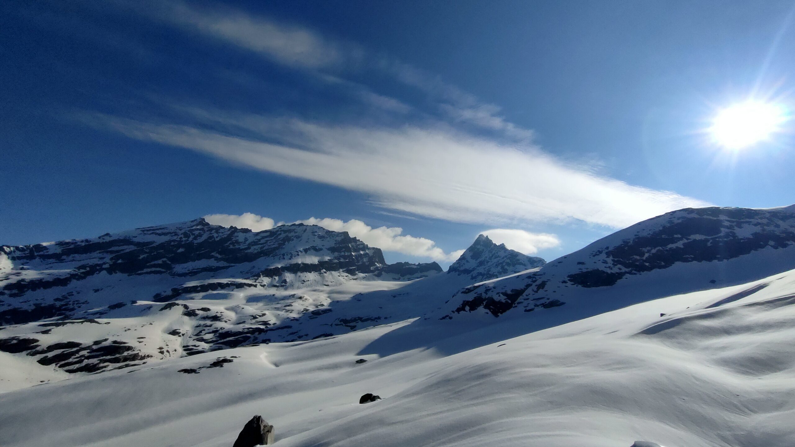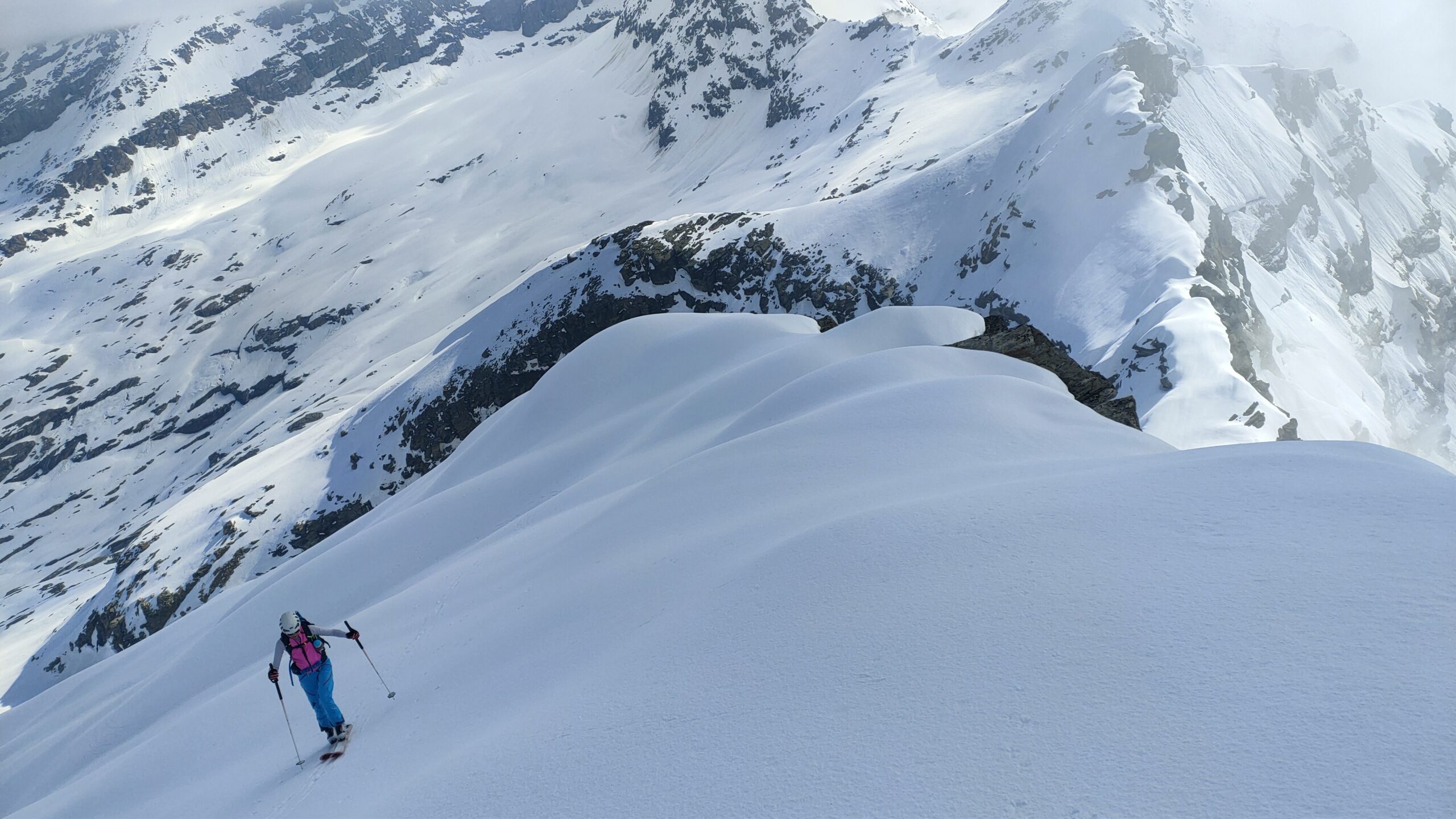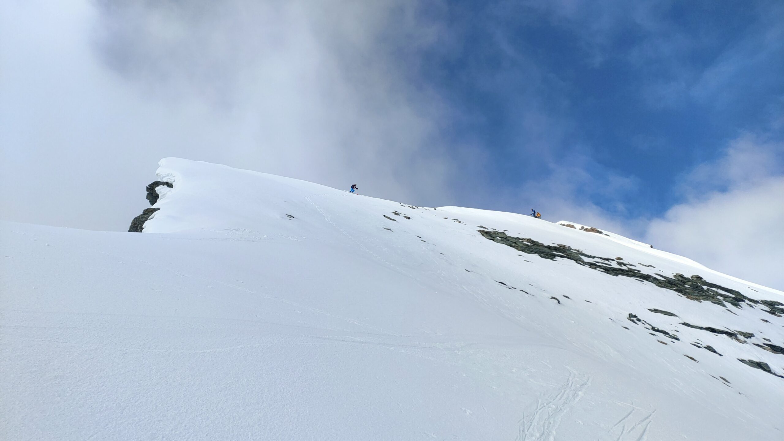 Sulla guida Toponeige e su Skitour l'itinerario è gradato 4,3 E3. A noi questa gradazione è apparsa eccessiva. Il risalto ripido che da accesso ai pendii sospesi è molto breve (ca. 80/100 mt) e l'unica altra parte ripida è costituita da due o tre curve partendo sci ai piedi dalla cima.