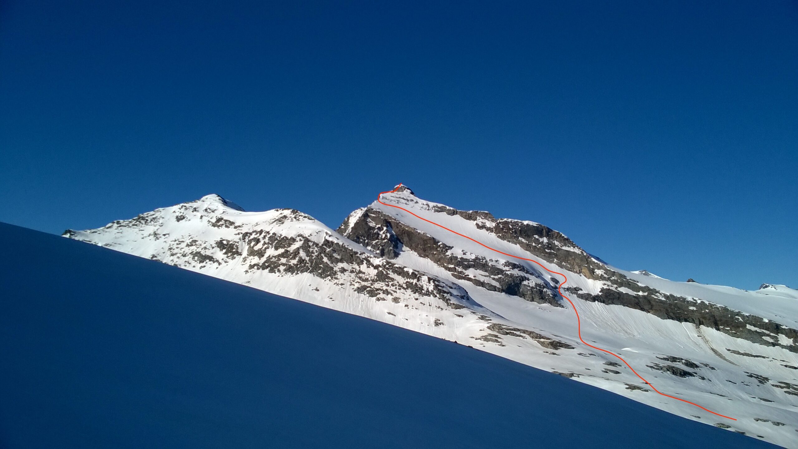 Da L’Ecot si segue la sterrata, un po’ noiosetta, fino a la Duis, quindi, in assenza di neve, si mantiene il sentiero che si sviluppa sul lato destro orografico del vallone. Si perviene al pianoro morenico a quota 2700 mt circa. Di qui la parete e la cima sono ben visibili e inconfondibili (vedi foto). Perdendo leggermente quota, si segue il corso delle Sources de l’Arc inferieures . Si punta quindi al ripido risalto nevoso (ca. 45° non continui) , con isolotti di roccia, che adduce ai dolci pendii sospesi superiori. Di qui si raggiunge la cresta e, con percorso nuovamente più ripido, (ramponi) la vetta.
