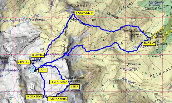 Da qui si scende e per sentiero si raggiunge la seconda meta, la Testa Rossa m. 2398. Ora, senza percorso obbligatorio, si scende su prati con direzione o/NO fino a raggiungere il Lago di Alpetto e poi il Rifugio.