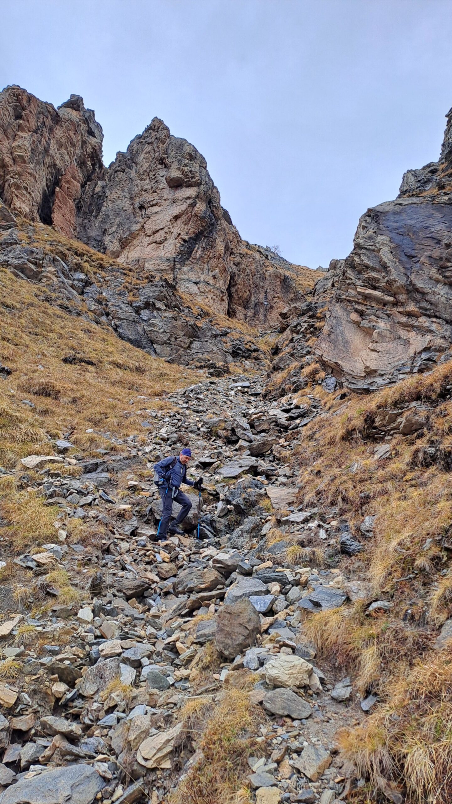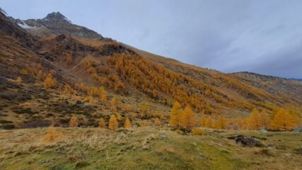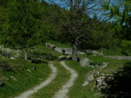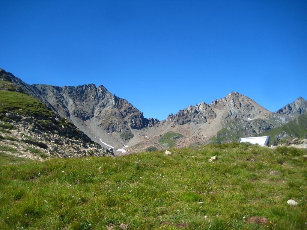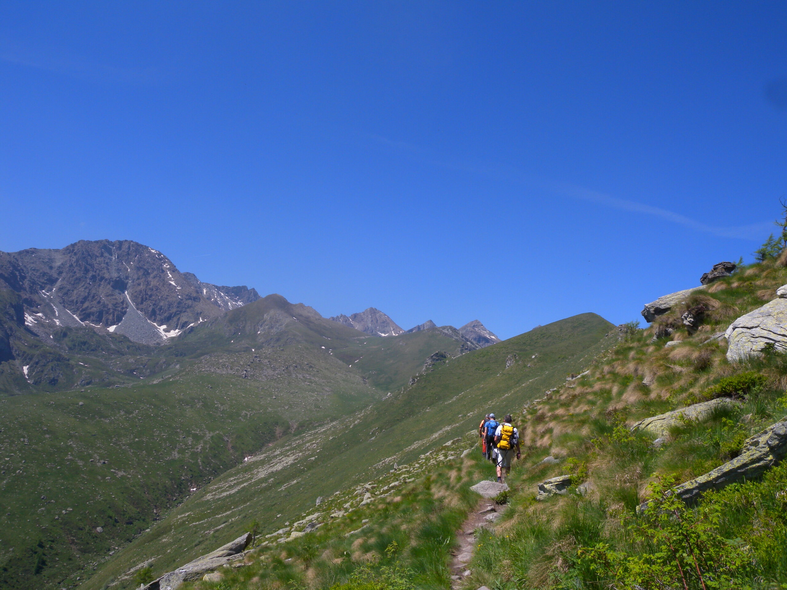 Si attrabersa il prato e si raggiunge il colletto posto a sud. Da qui si svolta a destra e si segue il lungo sentiero che con poca pendenza passa sotto la punta Salancia.