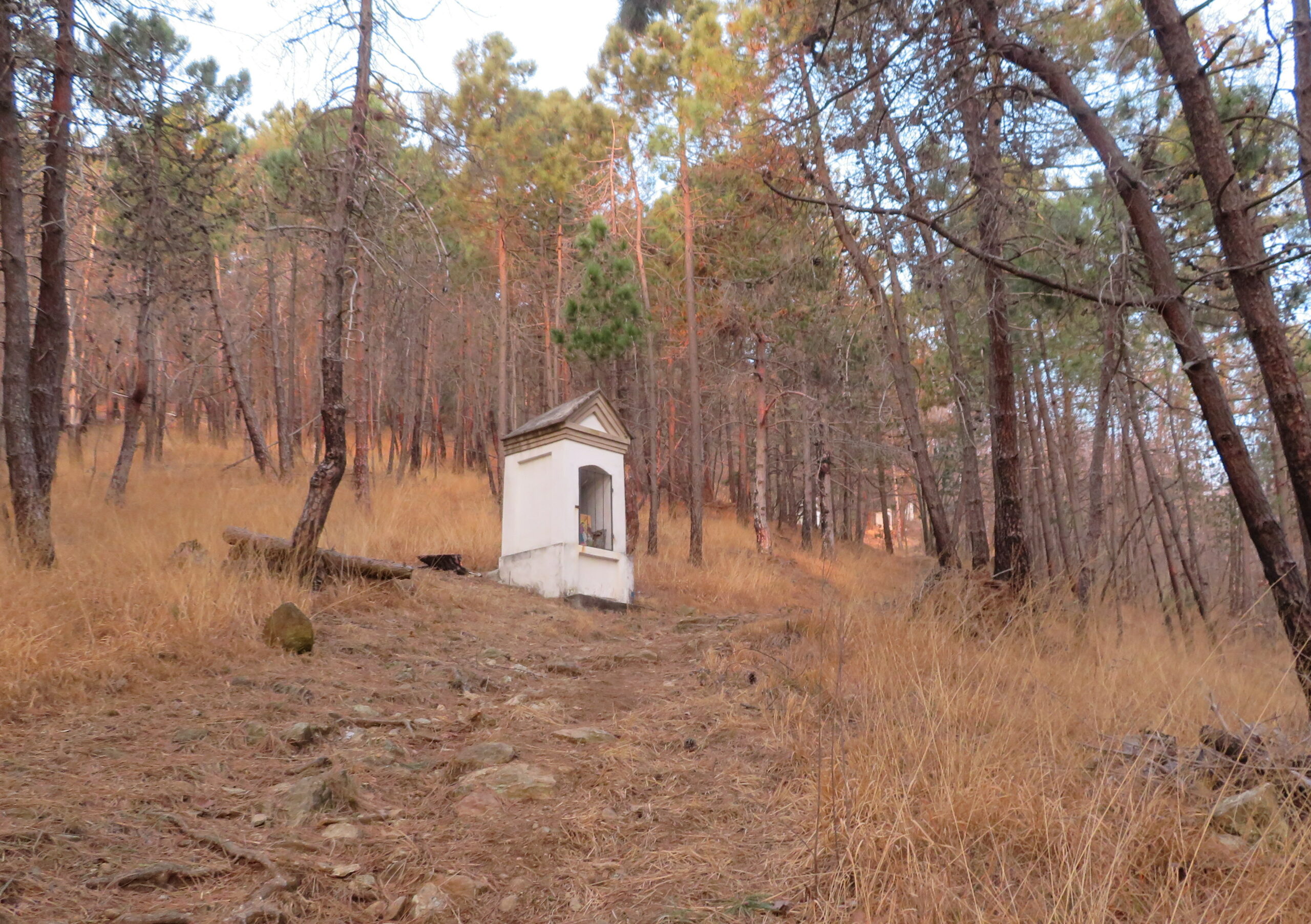Si attraversa un prato ormai invaso dalla vegetazione seguendo la traccia dritta e non a sinistra seguendo un evidente sentiero, poi si incontra una serie di piloni votivi, fino a giungere sulla modesta sommità del Monte Calvo 520 m. dove sorge la Cappella della Sacra Famiglia.