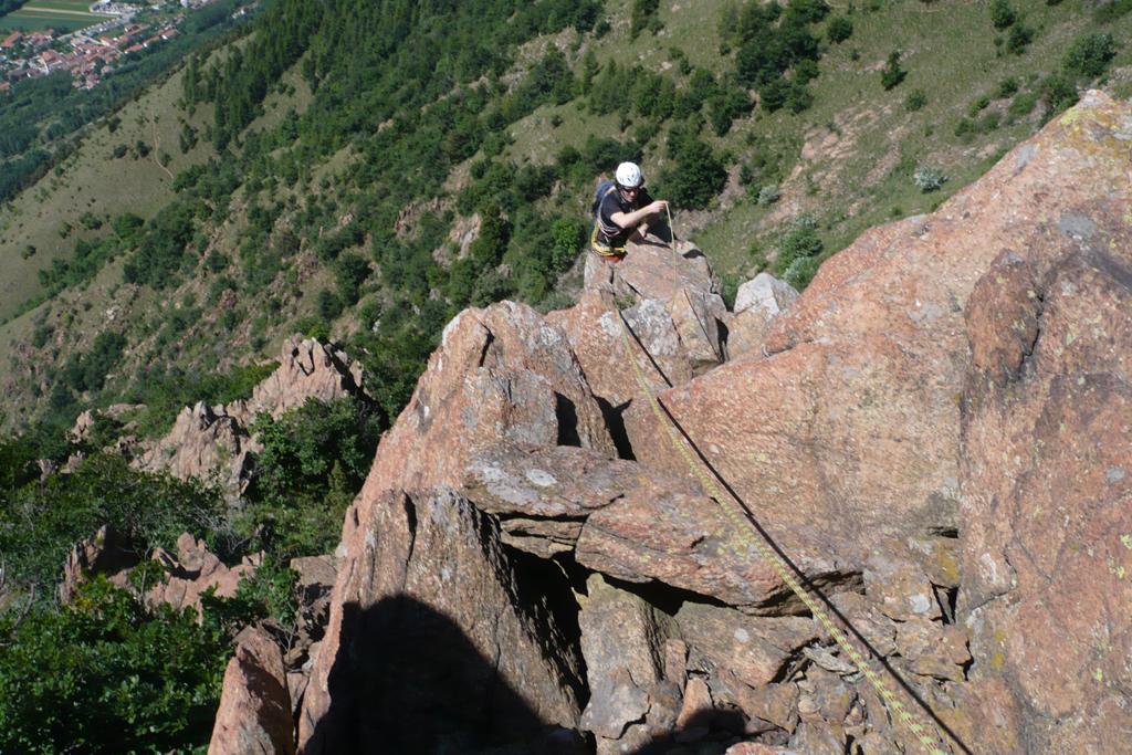 A metà sperone sx,la bella placca verticale (4°) precede l’ultimo tiro impegnativo (4°+/5-) che deposita su una terrazza panoramica alla base della cresta finale, aerea e facile che conduce al libro di via (3°). Seguendo i bolli bianchi, in 5 min. in vetta.