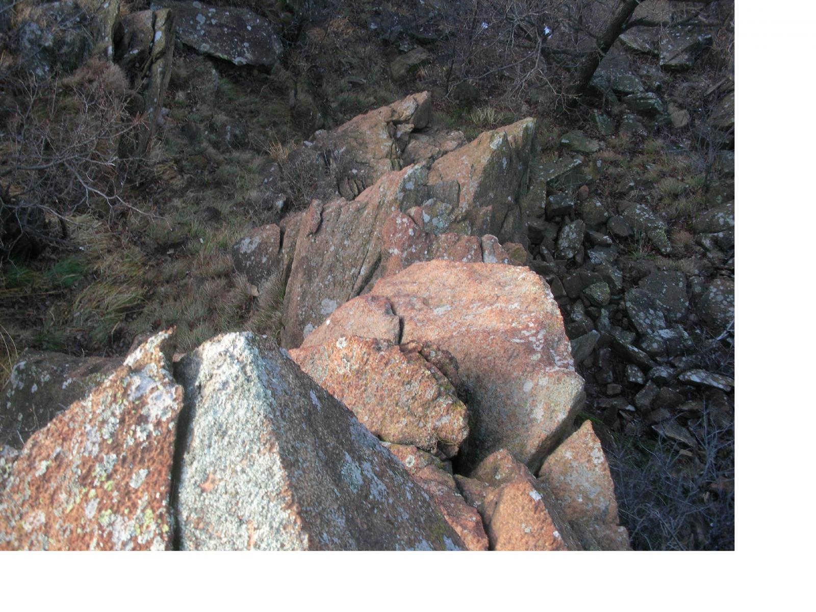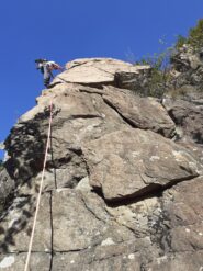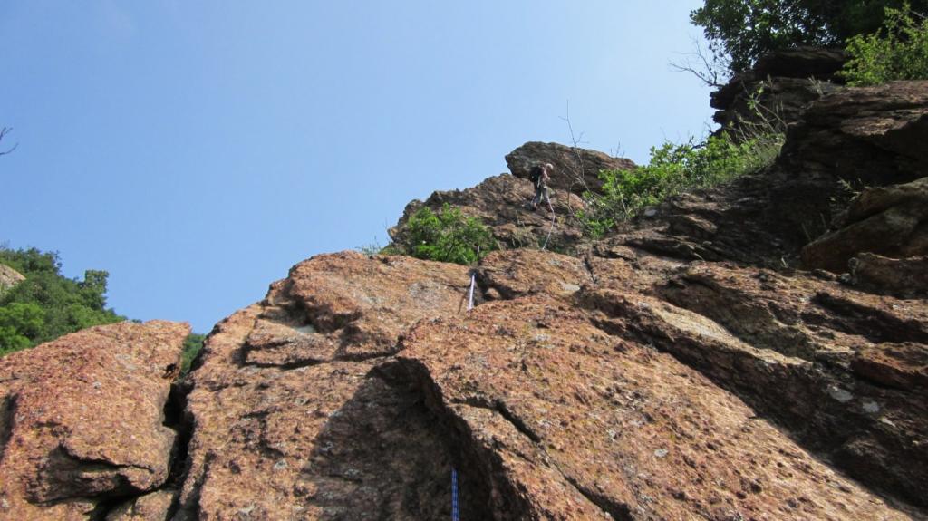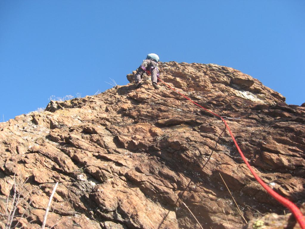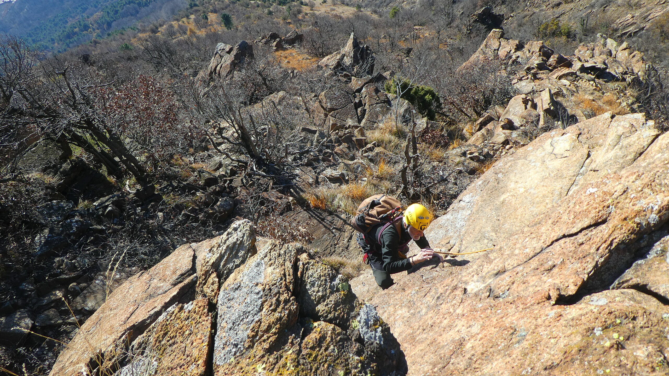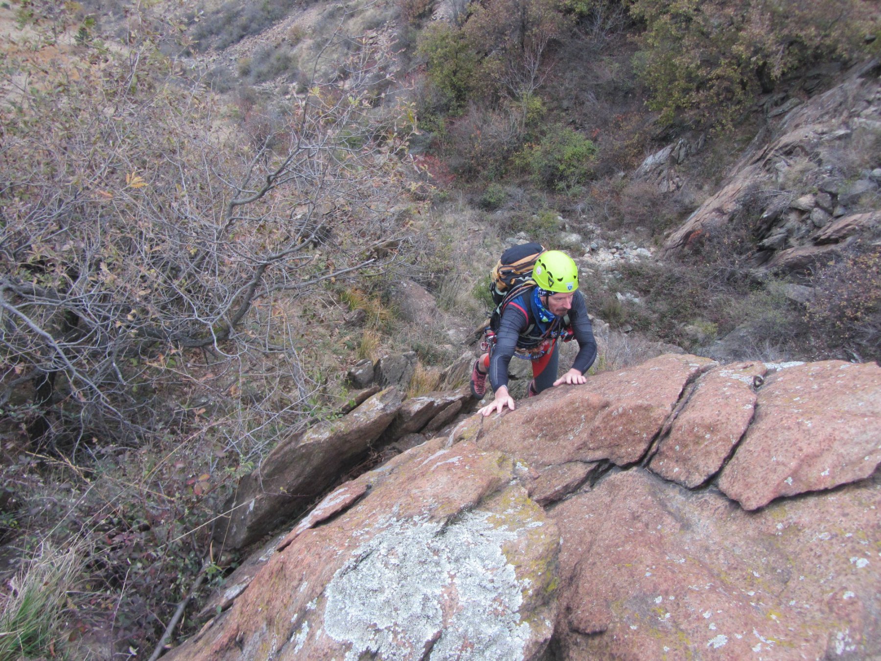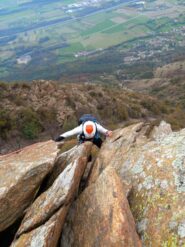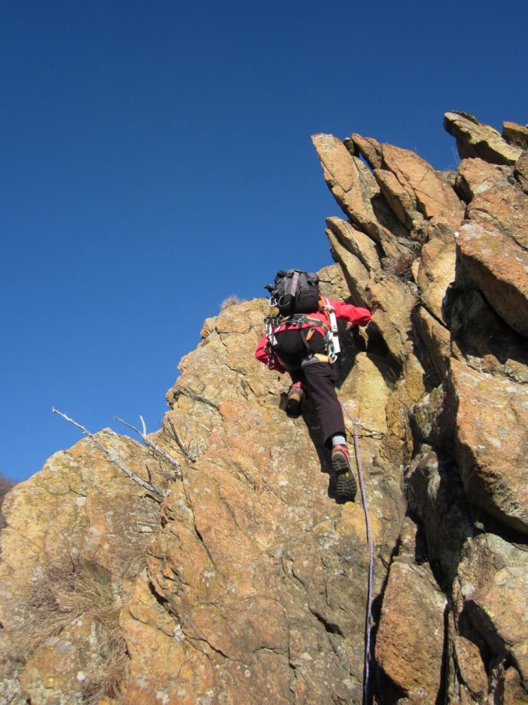 Pochi mt sopra il sentiero inizia una serie di corte placche compatte che portano ad un primo salto verticale di roccia bellissima (3°+). Seguire poi la cresta, scendere 2 mt a sx alla base di un secondo lungo sperone che si scala fino ad un piano con blocchi (4°).