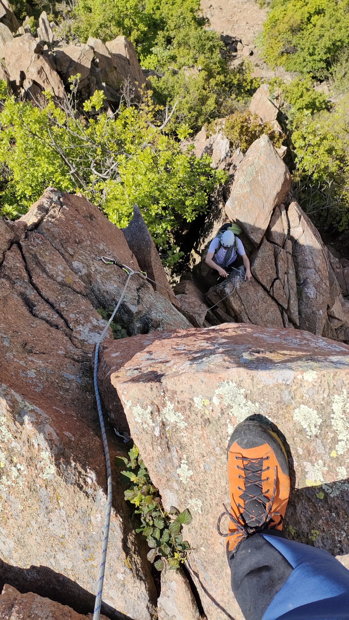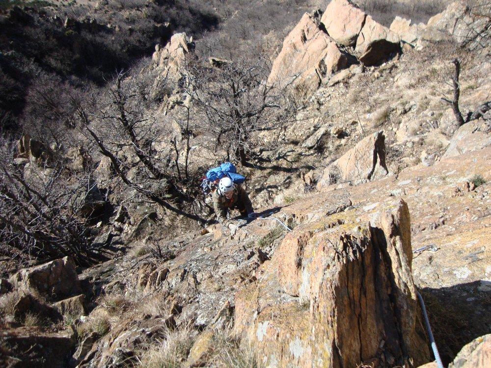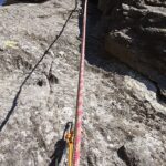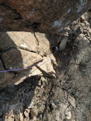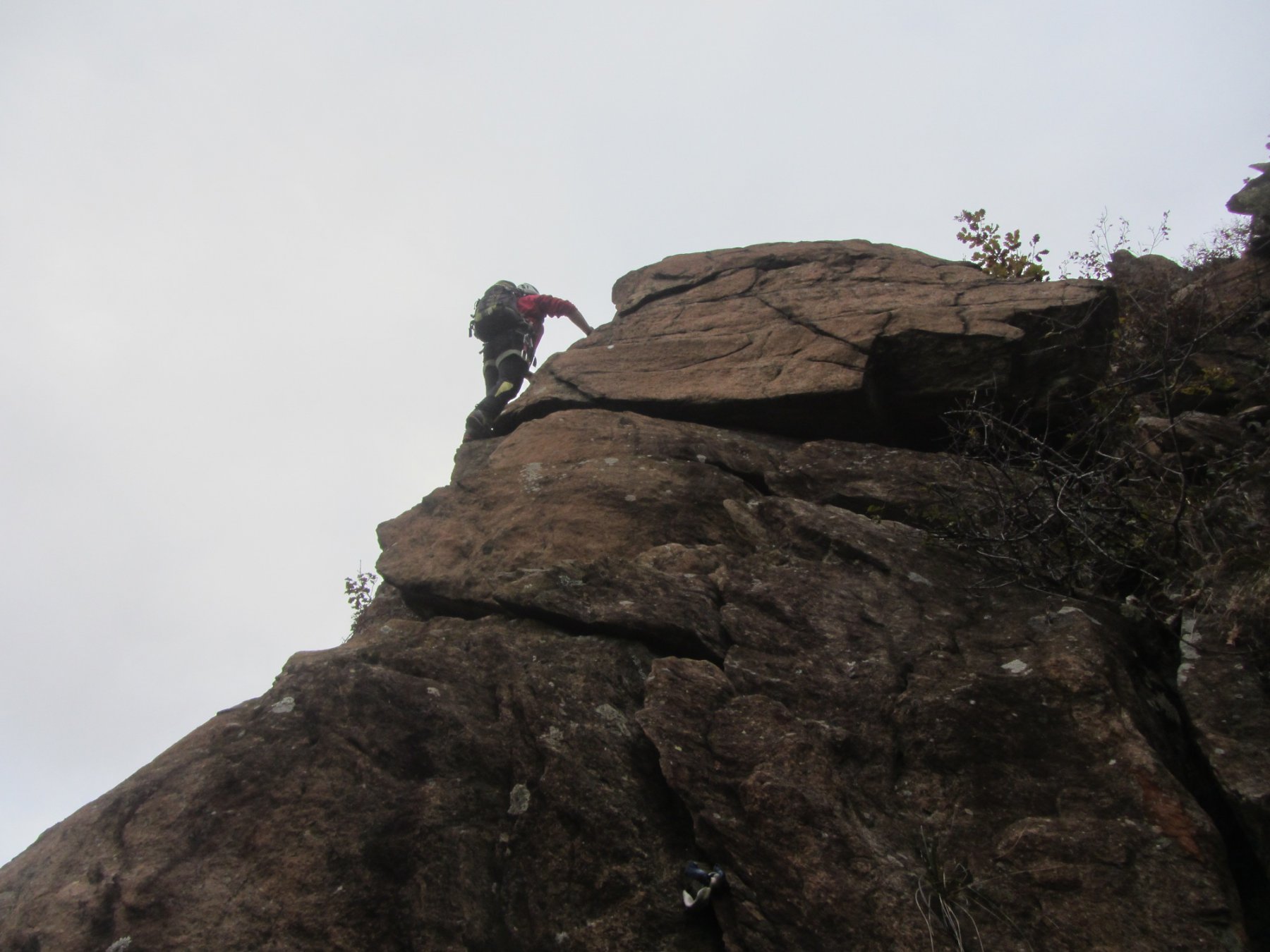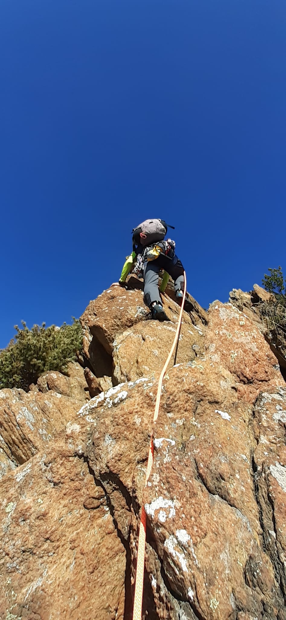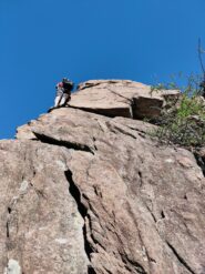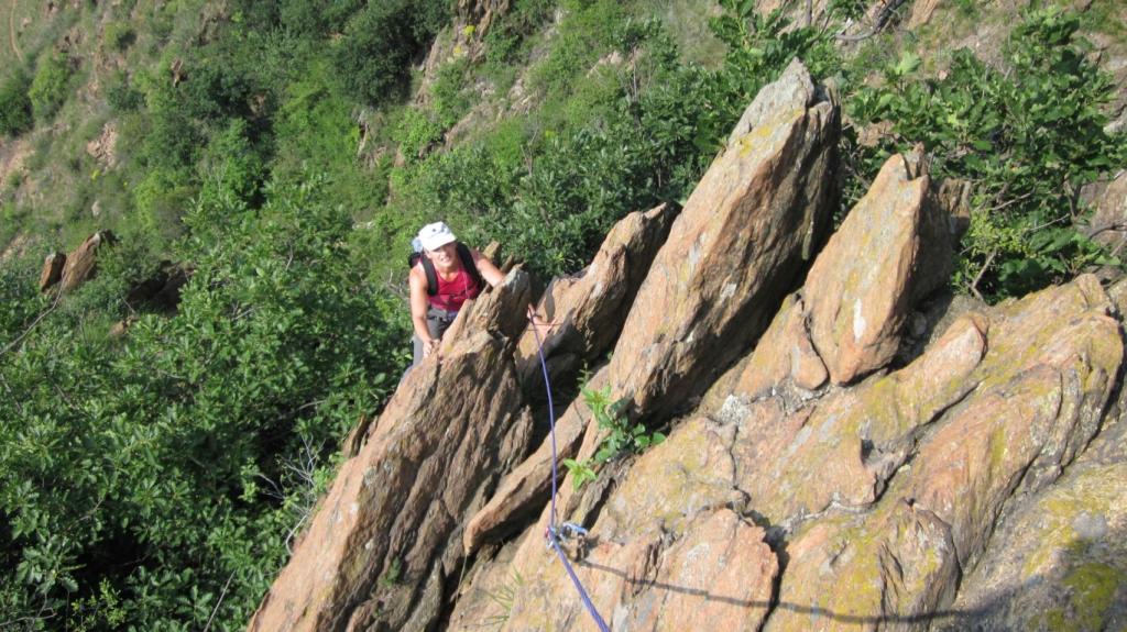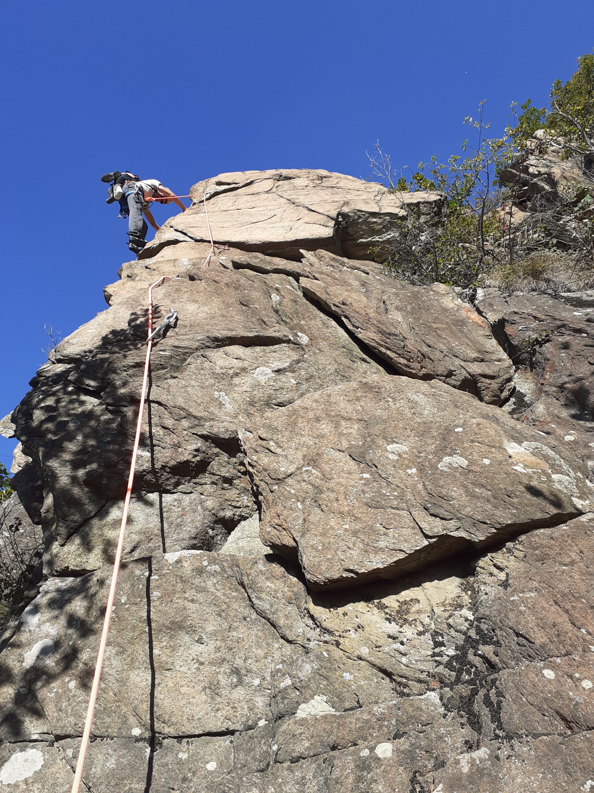 Pochi mt sopra il sentiero inizia una serie di corte placche compatte che portano ad un primo salto verticale di roccia bellissima (3°+). Seguire poi la cresta, scendere 2 mt a sx alla base di un secondo lungo sperone che si scala fino ad un piano con blocchi (4°).