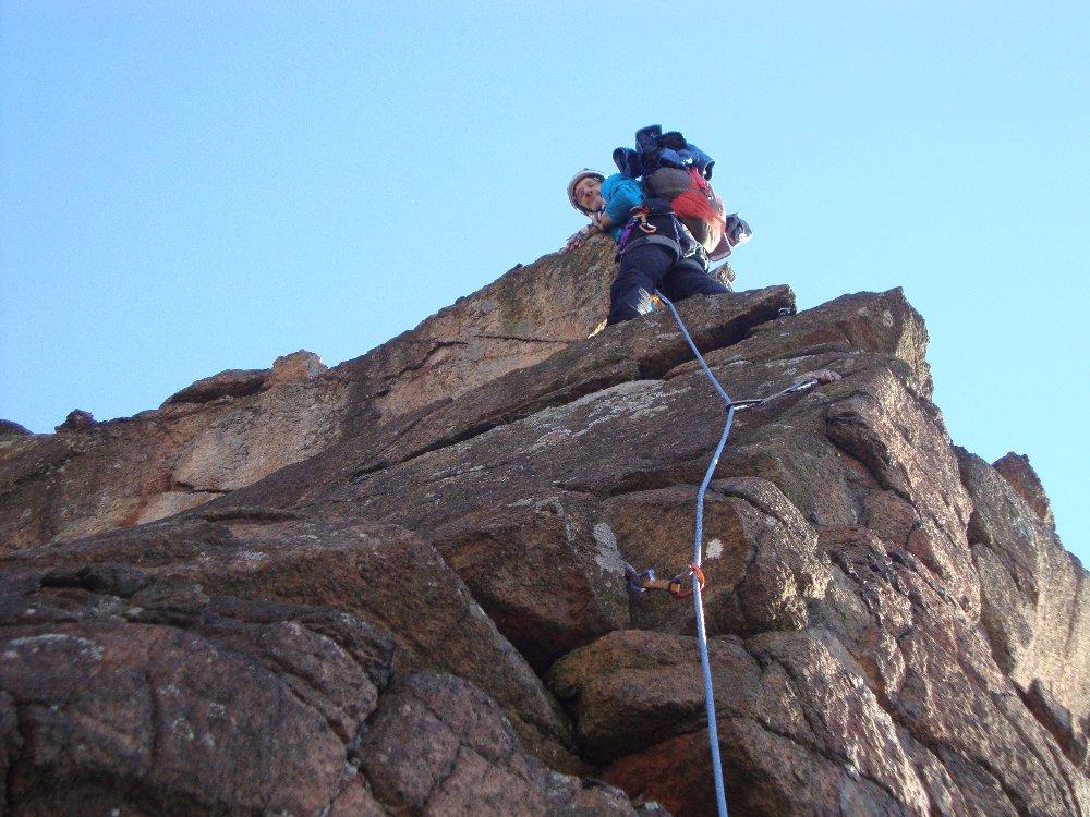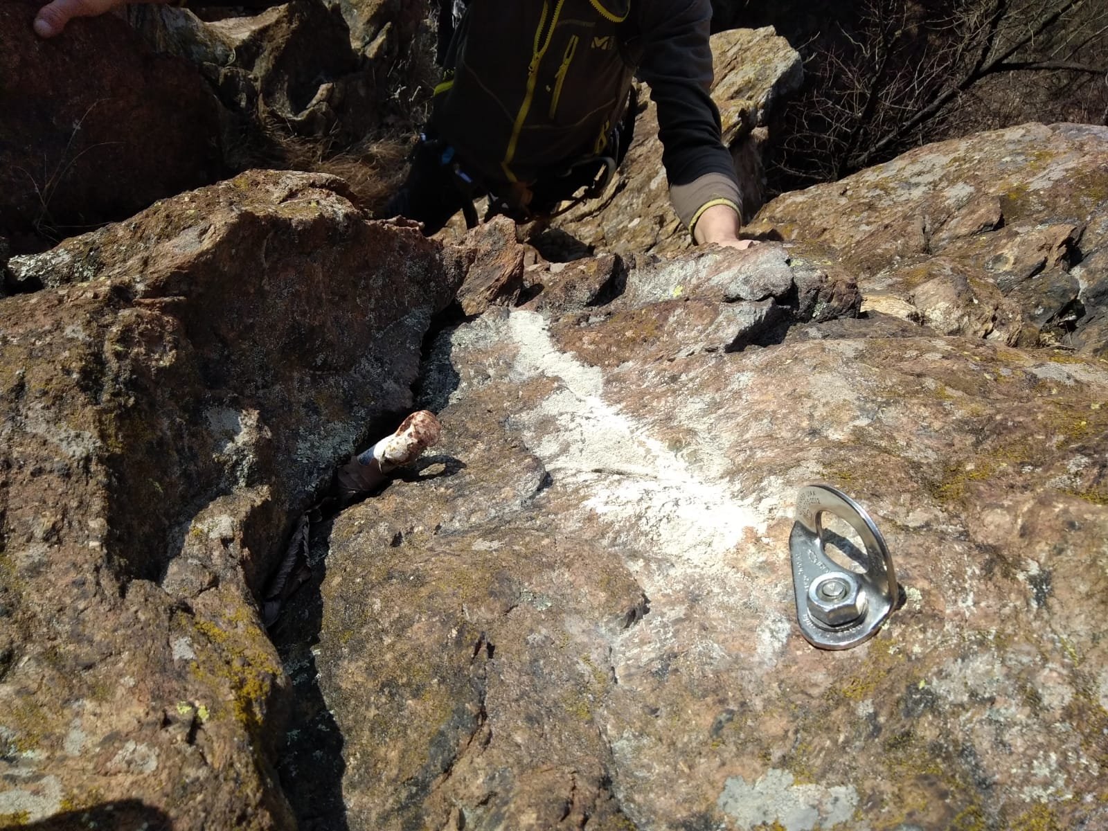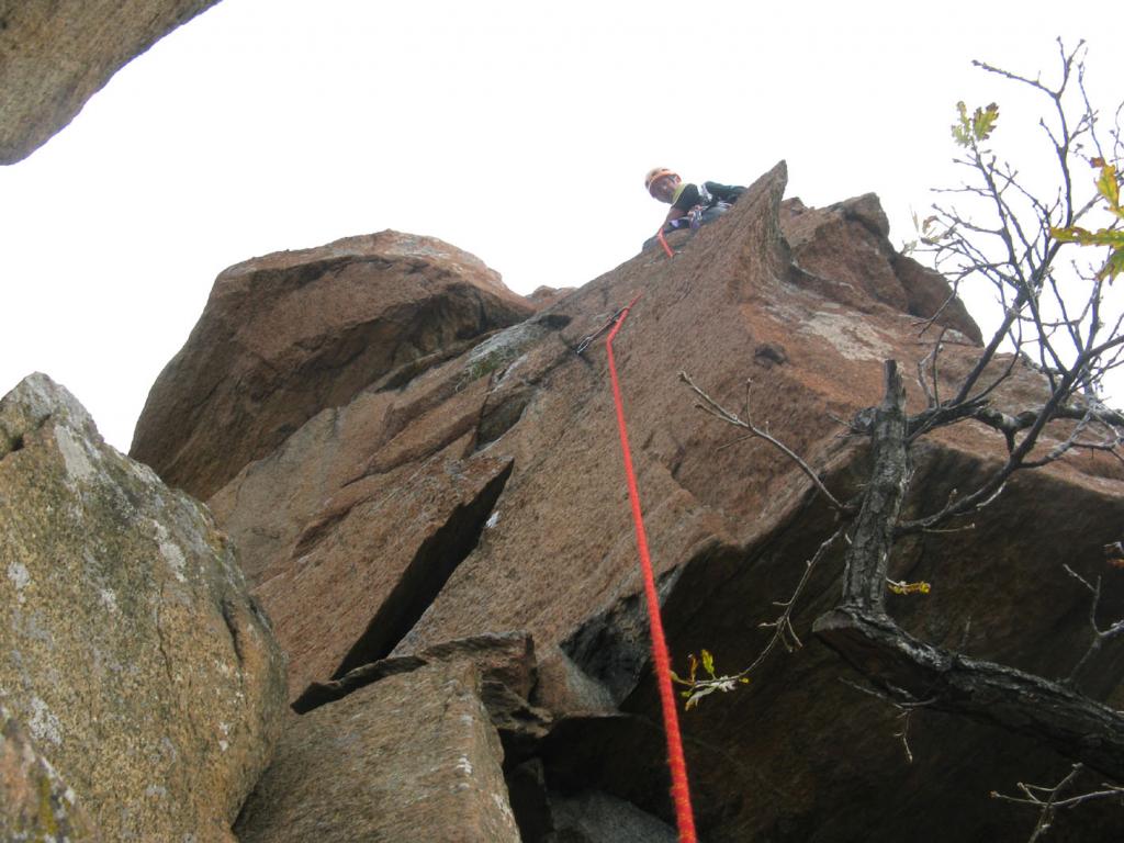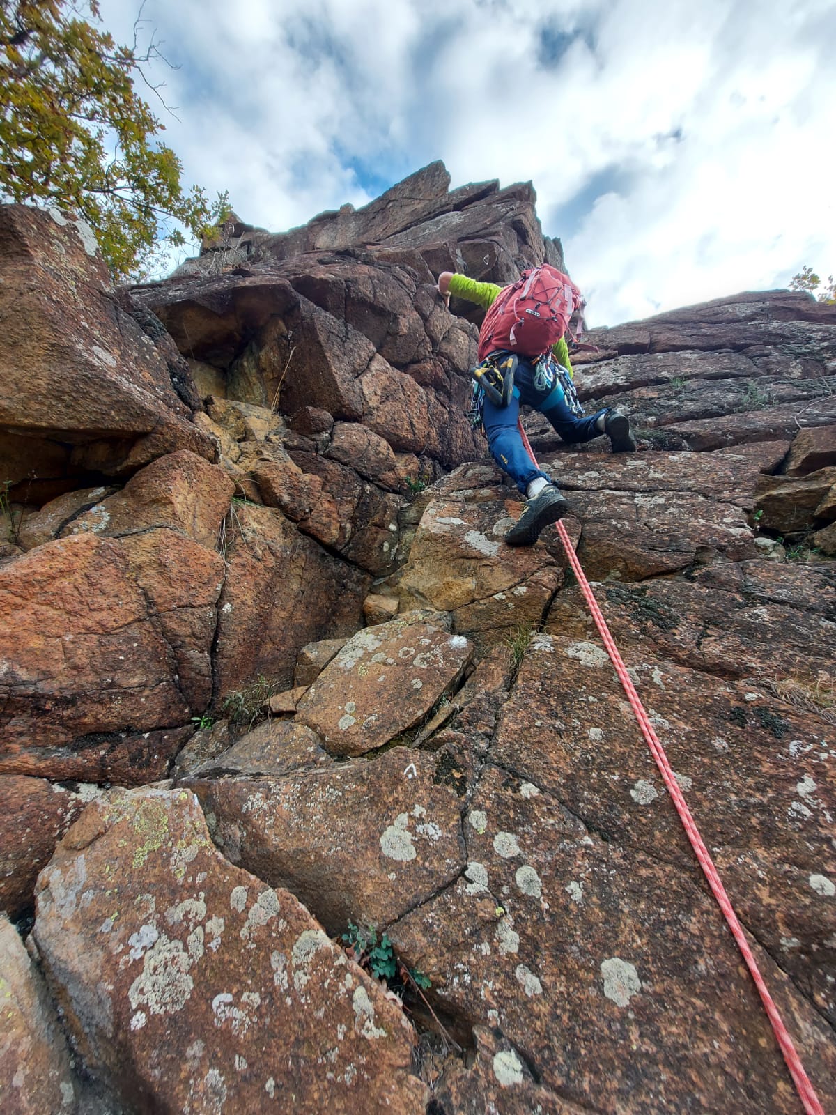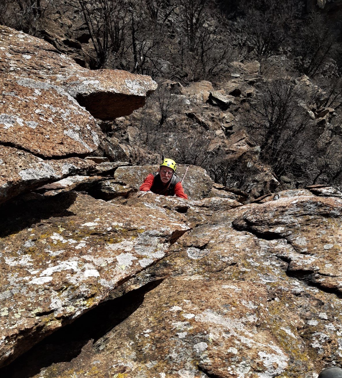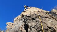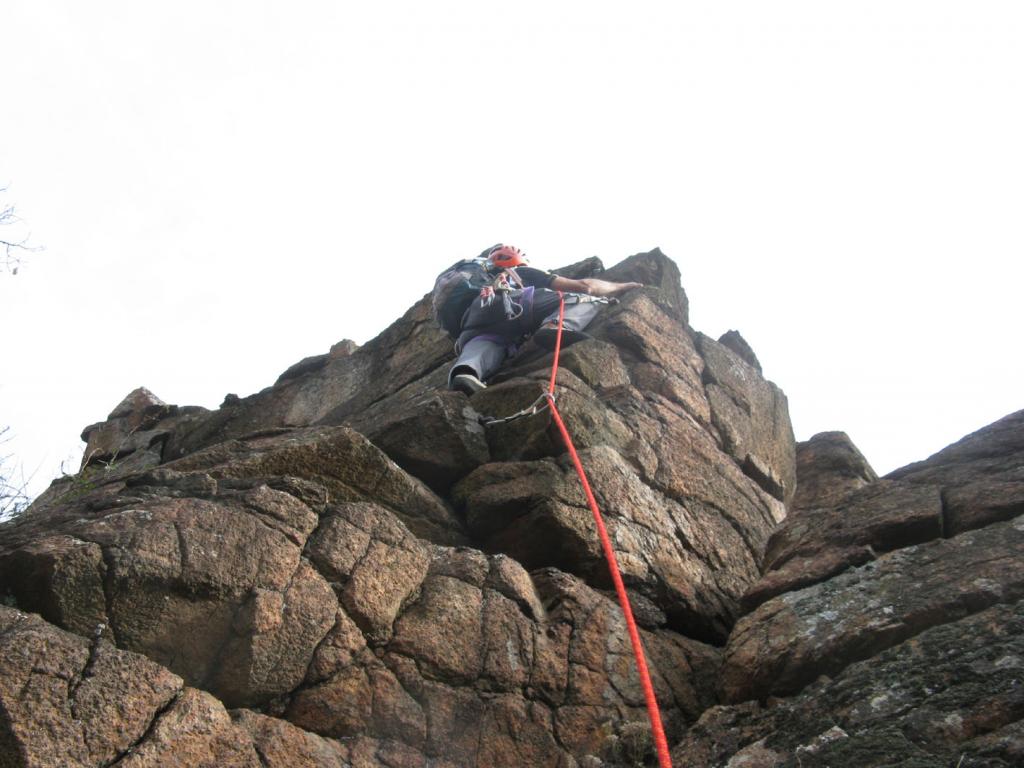 Pochi mt sopra il sentiero inizia una serie di corte placche compatte che portano ad un primo salto verticale di roccia bellissima (3°+). Seguire poi la cresta, scendere 2 mt a sx alla base di un secondo lungo sperone che si scala fino ad un piano con blocchi (4°).