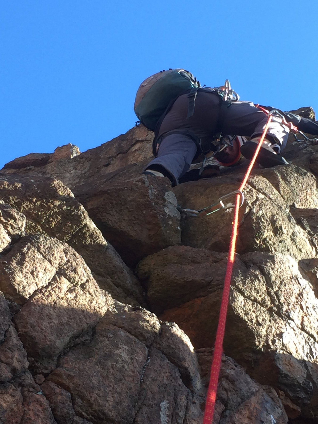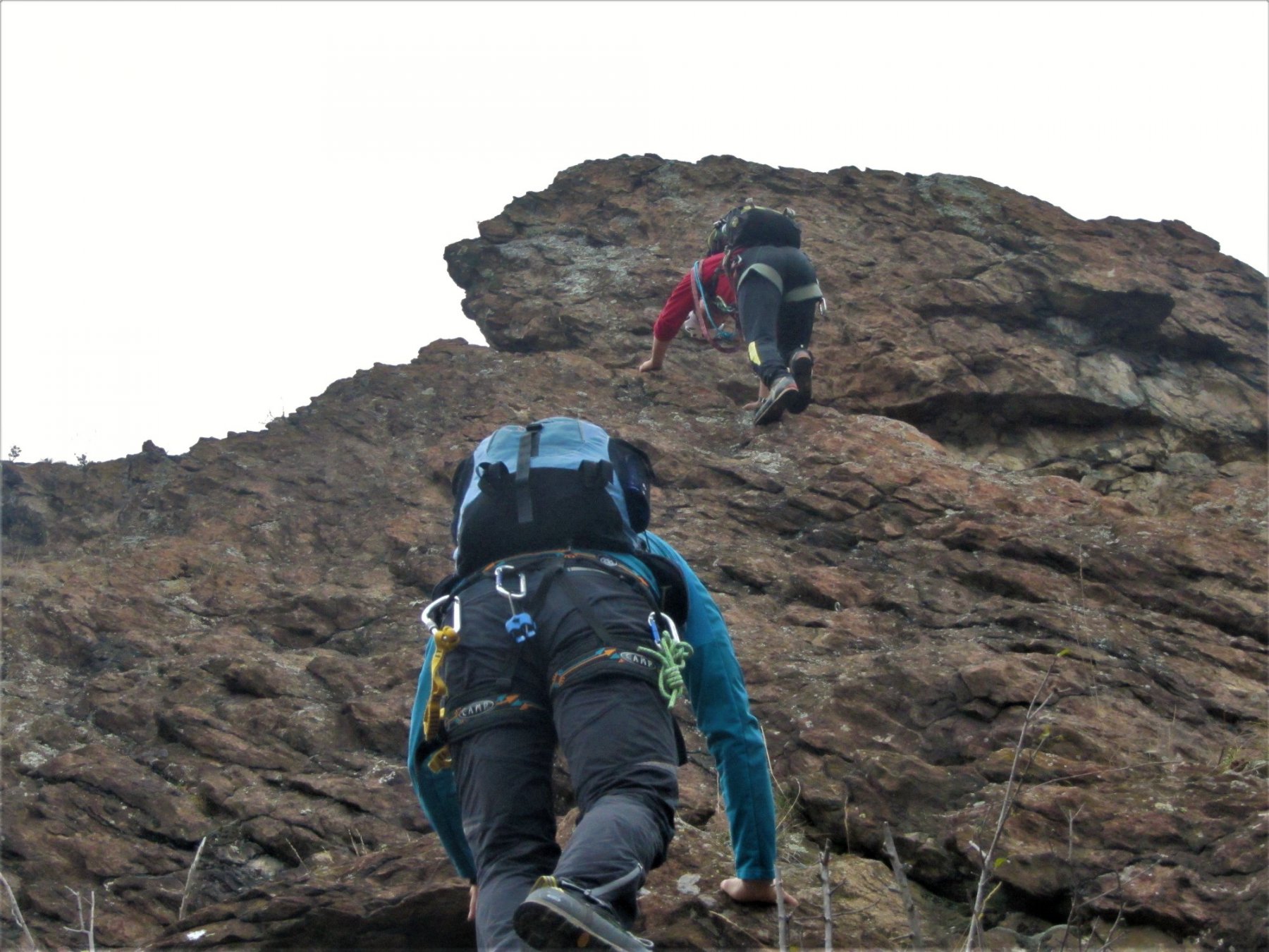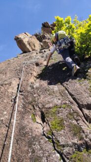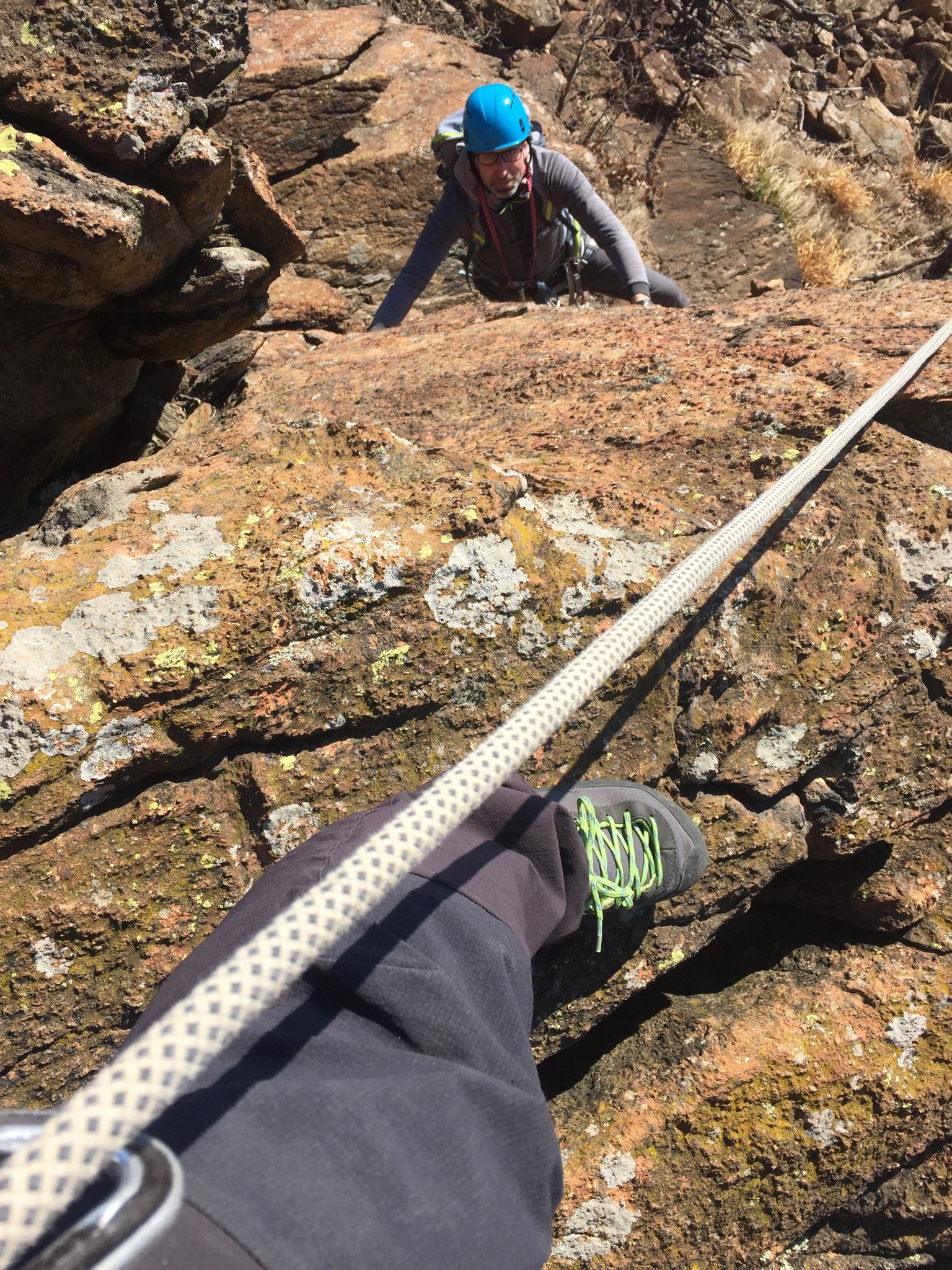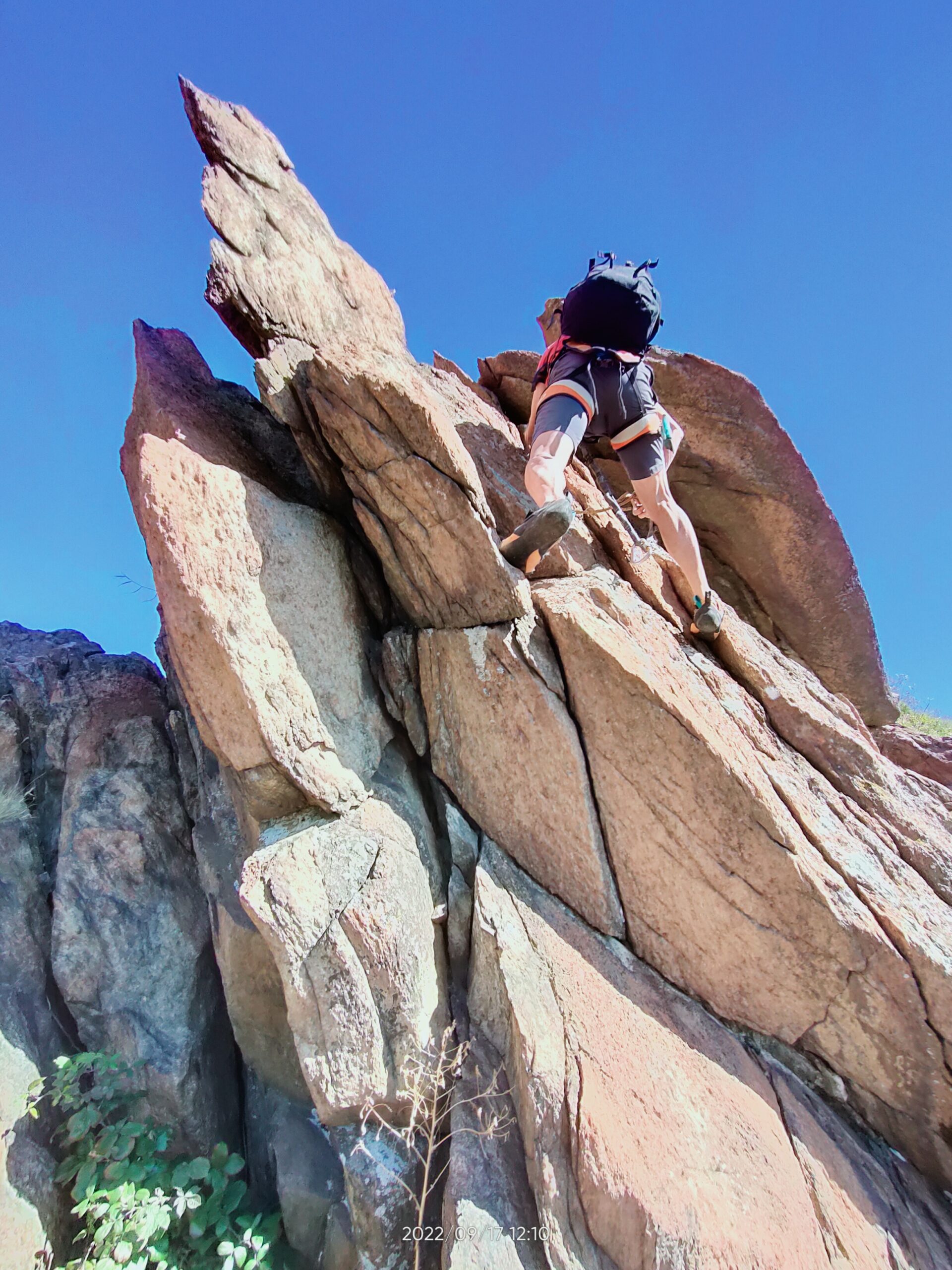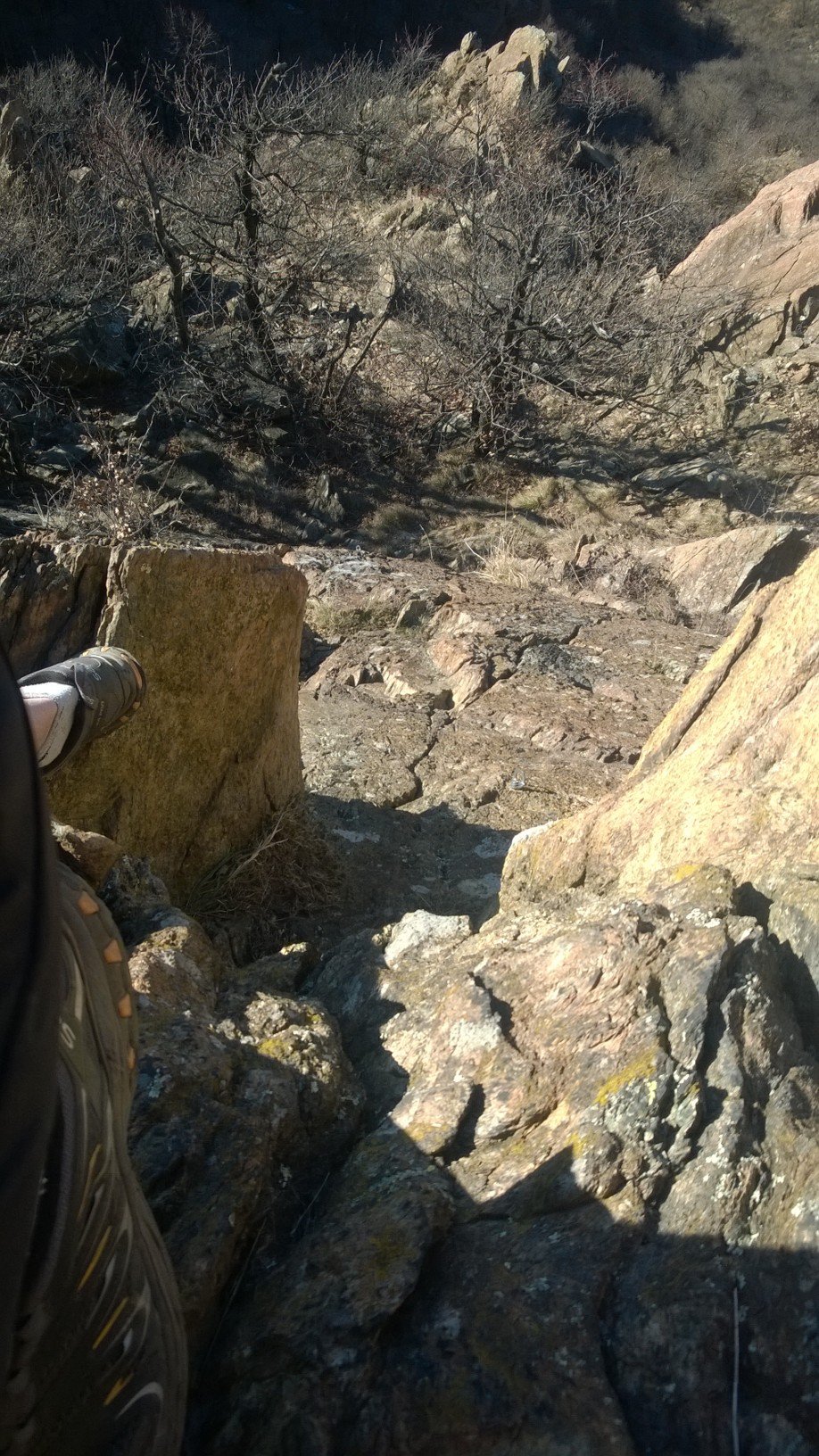 Pochi mt sopra il sentiero inizia una serie di corte placche compatte che portano ad un primo salto verticale di roccia bellissima (3°+). Seguire poi la cresta, scendere 2 mt a sx alla base di un secondo lungo sperone che si scala fino ad un piano con blocchi (4°).