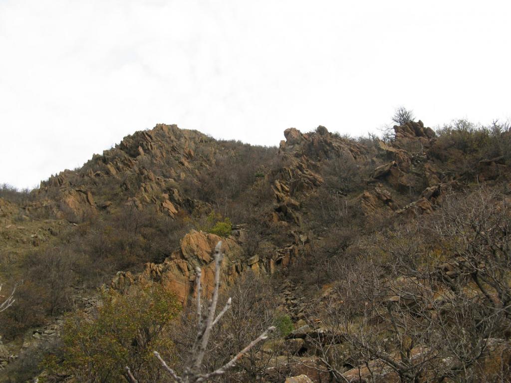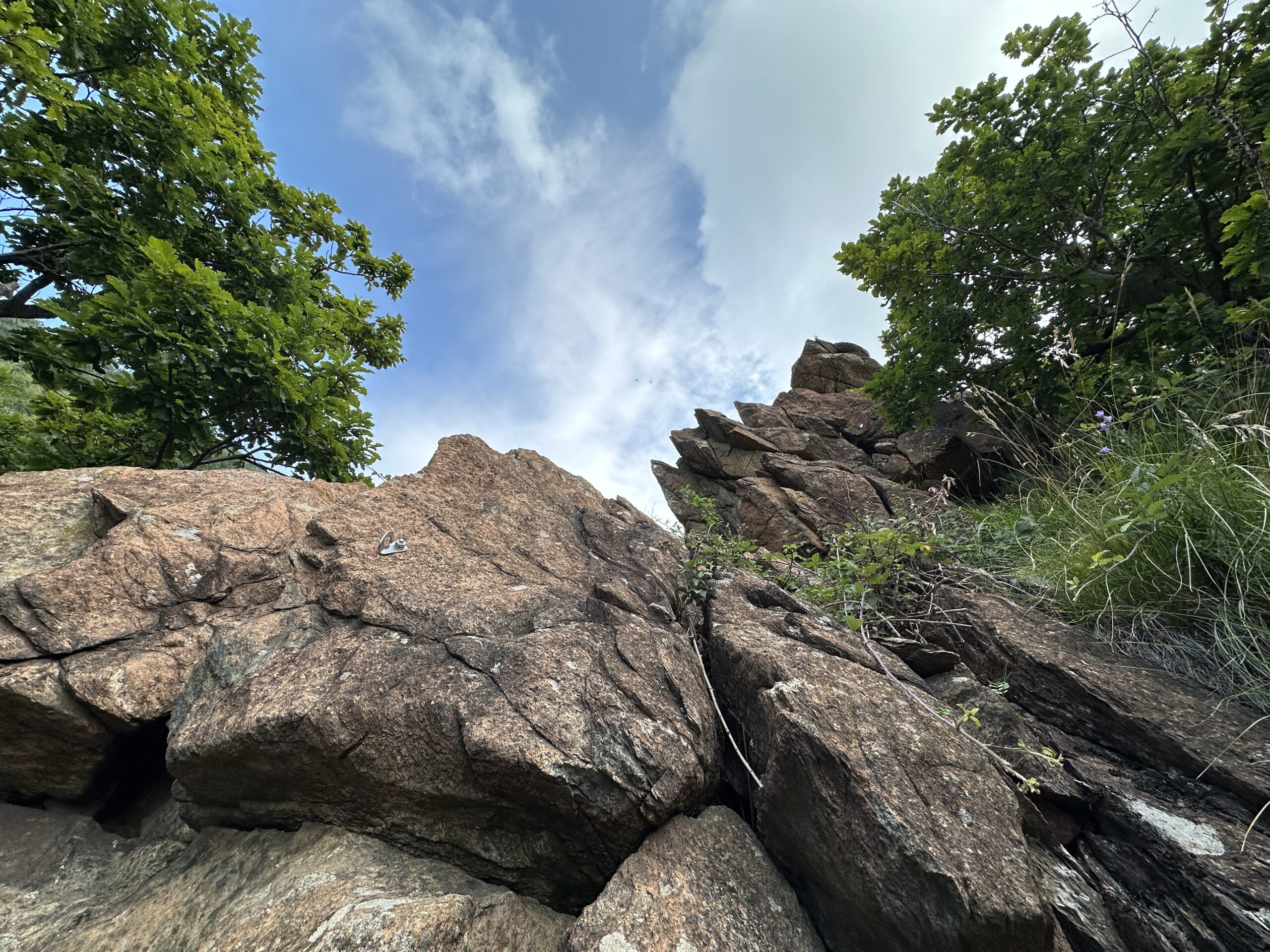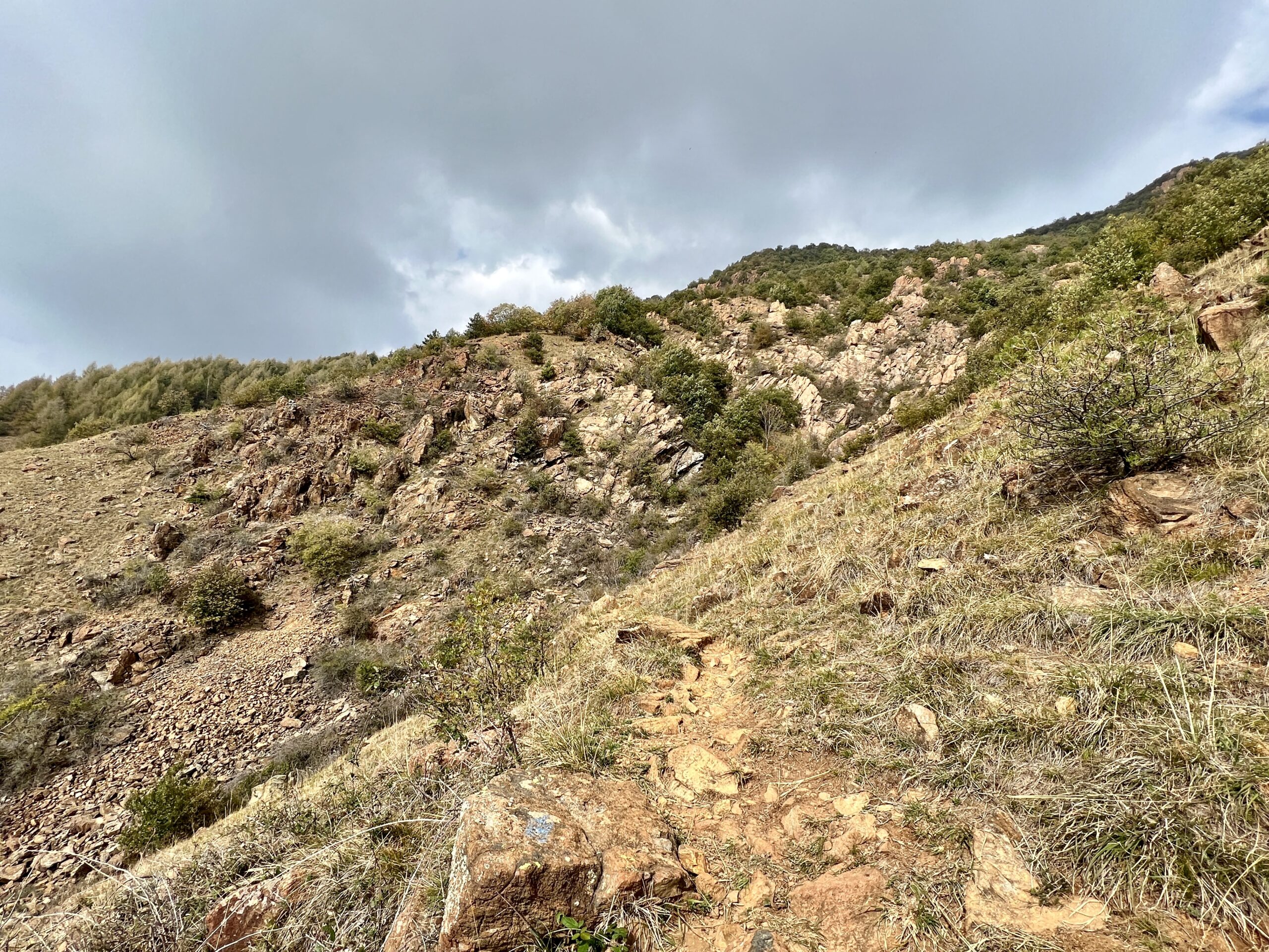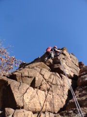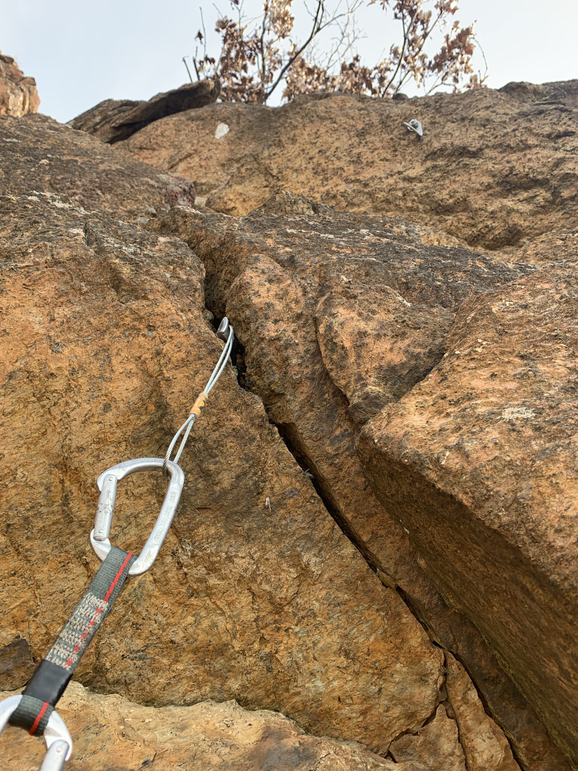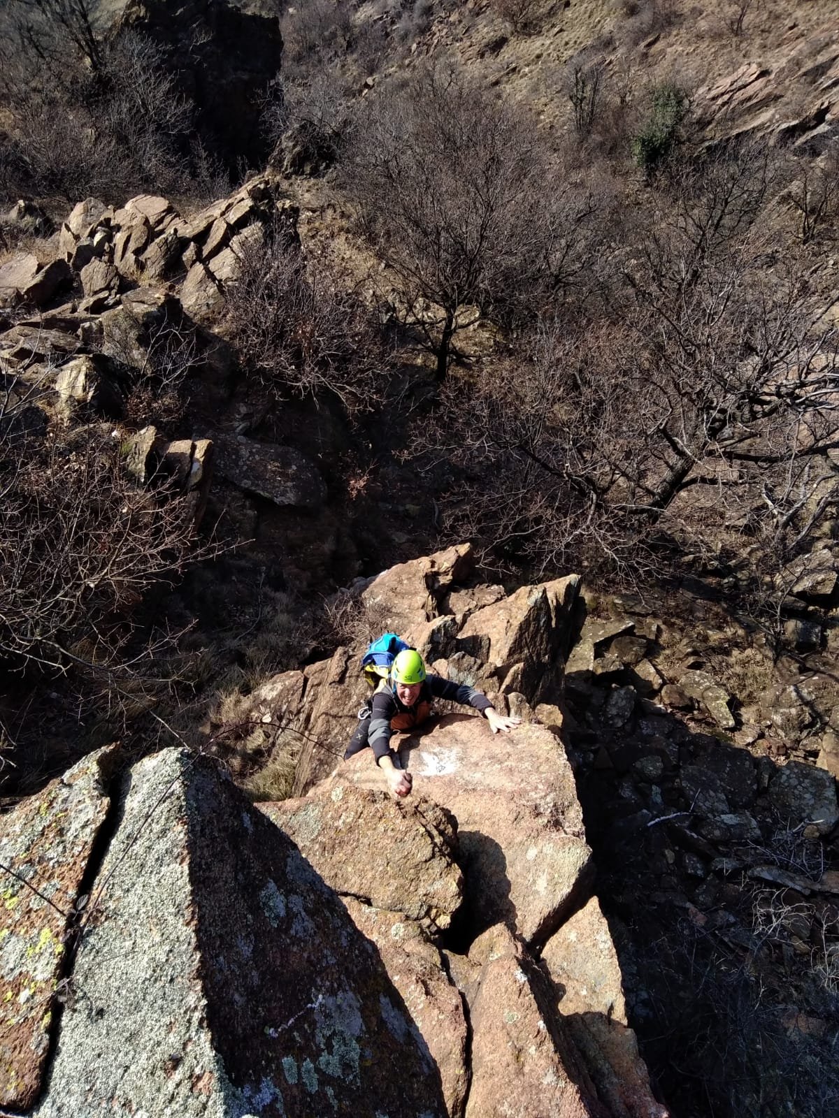 Pochi mt sopra il sentiero inizia una serie di corte placche compatte che portano ad un primo salto verticale di roccia bellissima (3°+). Seguire poi la cresta, scendere 2 mt a sx alla base di un secondo lungo sperone che si scala fino ad un piano con blocchi (4°).