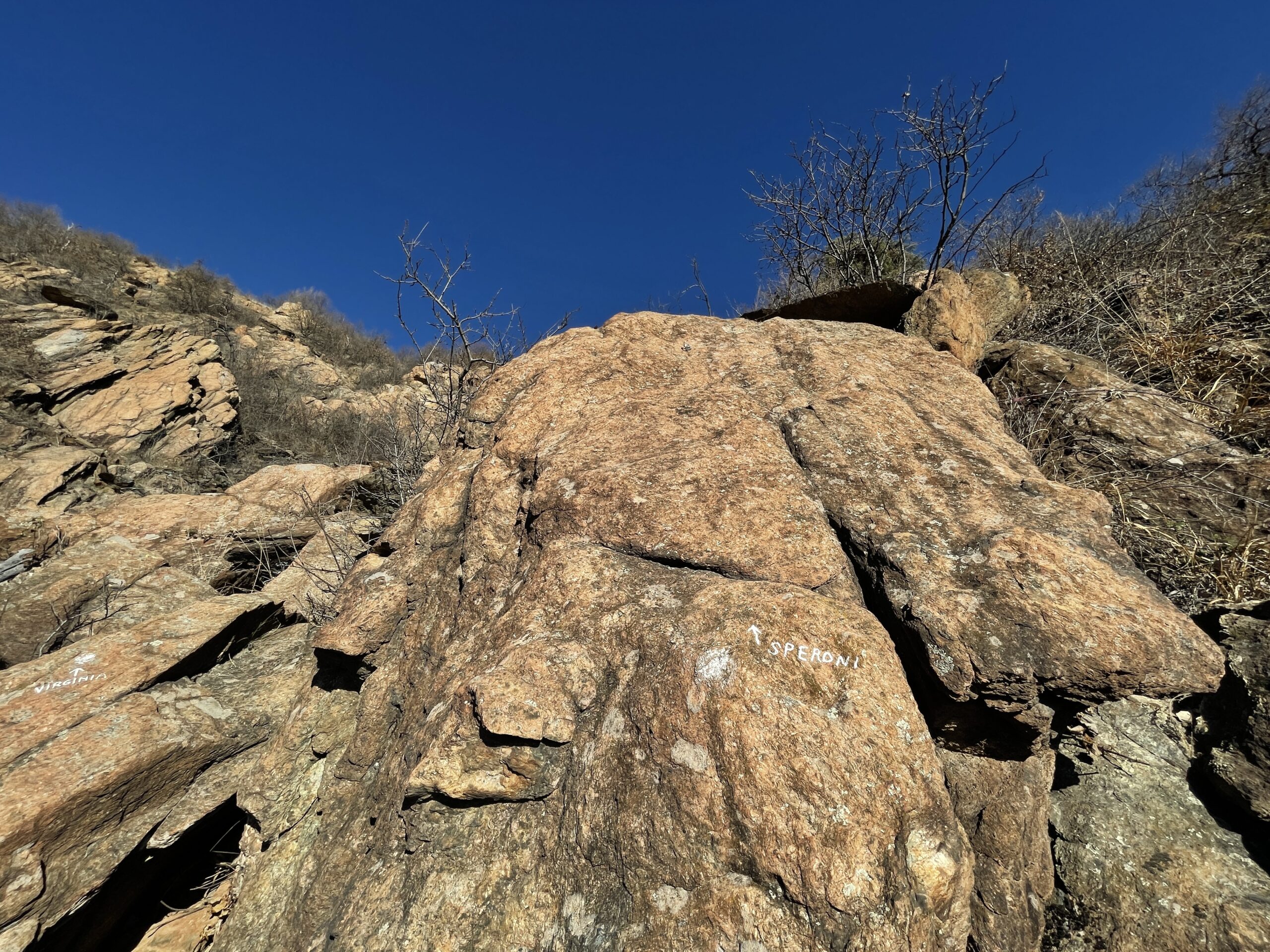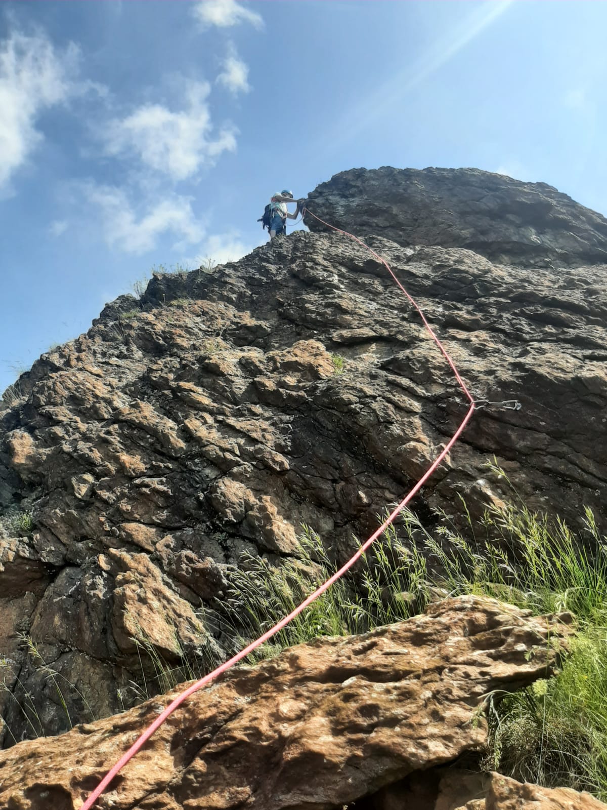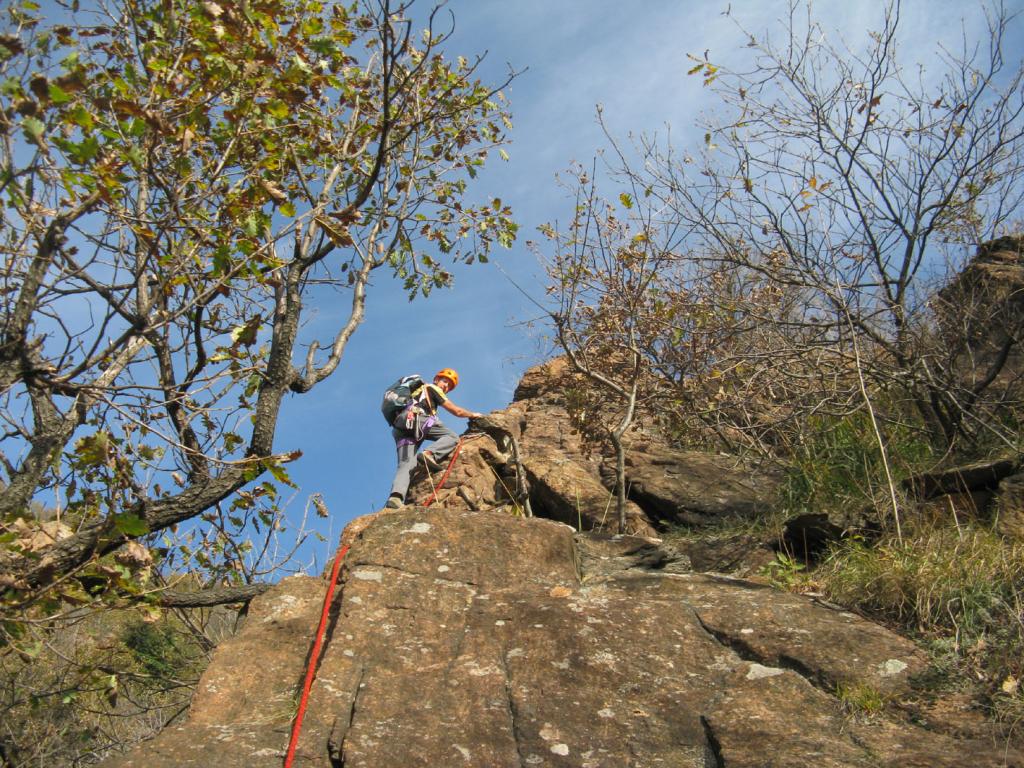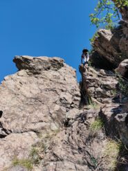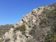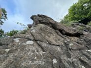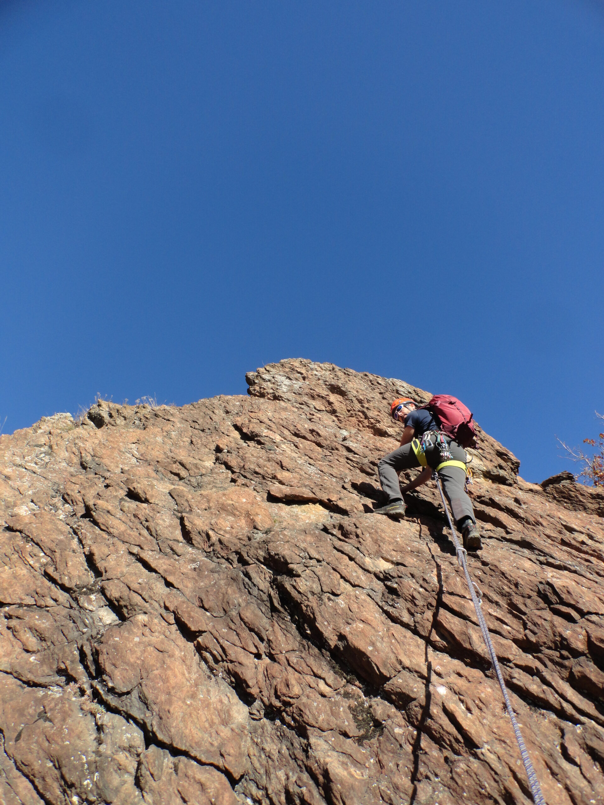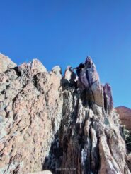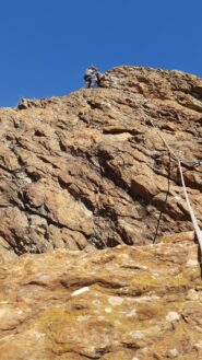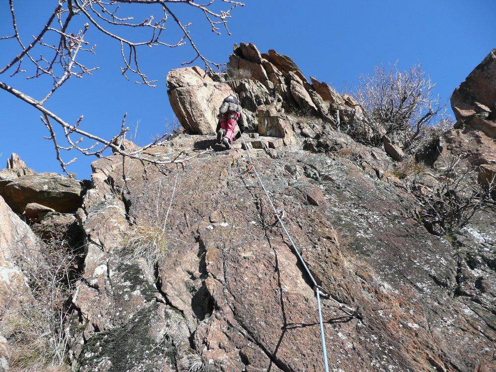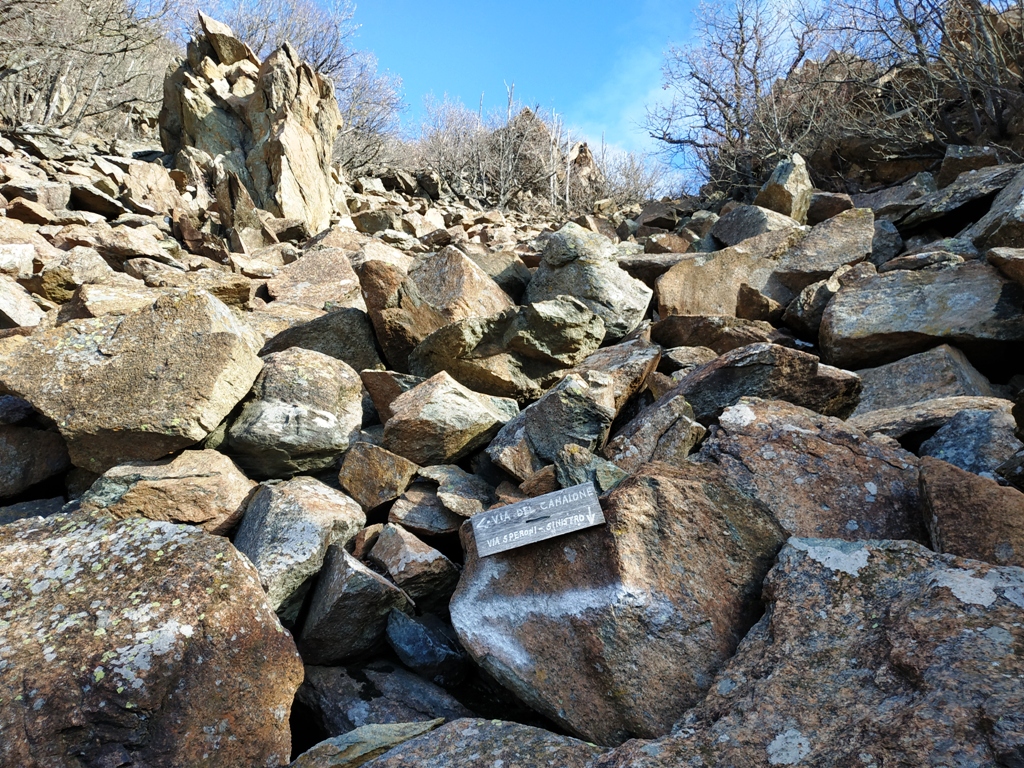 La segnaletica ora indica di scendere lungo la pietraia per 5 min per attaccare lo sperone sinistro che porterà in vetta. Si può anche solo attraversarla per evitare la pur breve discesa riprendendo l’arrampicata a metà dello sperone dove, trà l’altro, ci sono i passaggi più interessanti, ma per completezza consiglio l’attacco alla base per non perdere il primo tiro su roccia stupenda (4°).