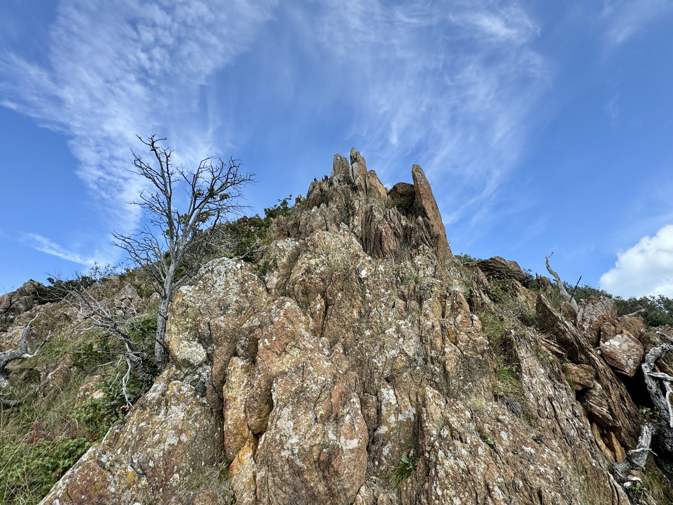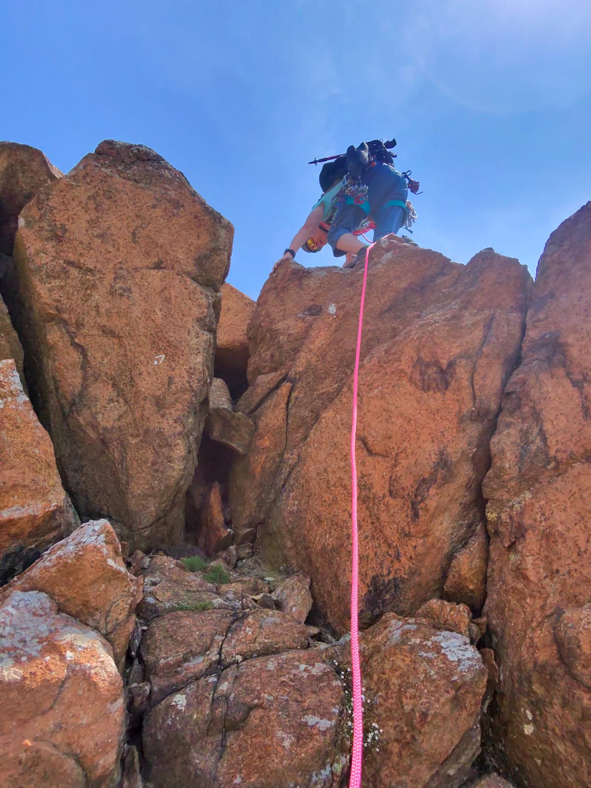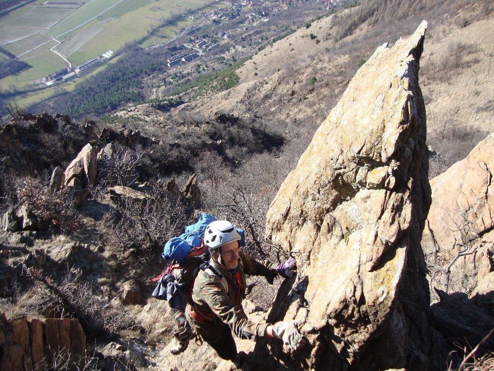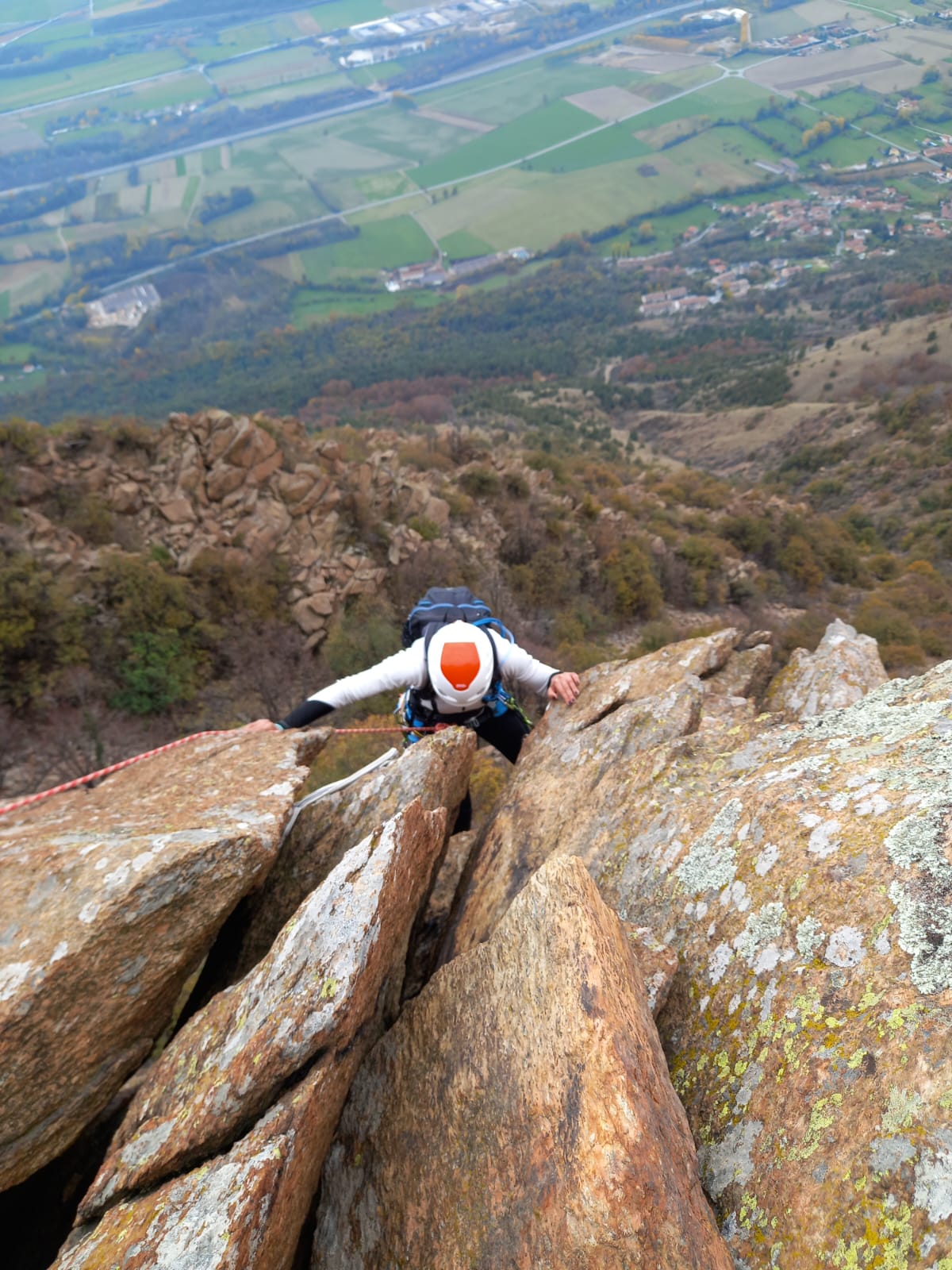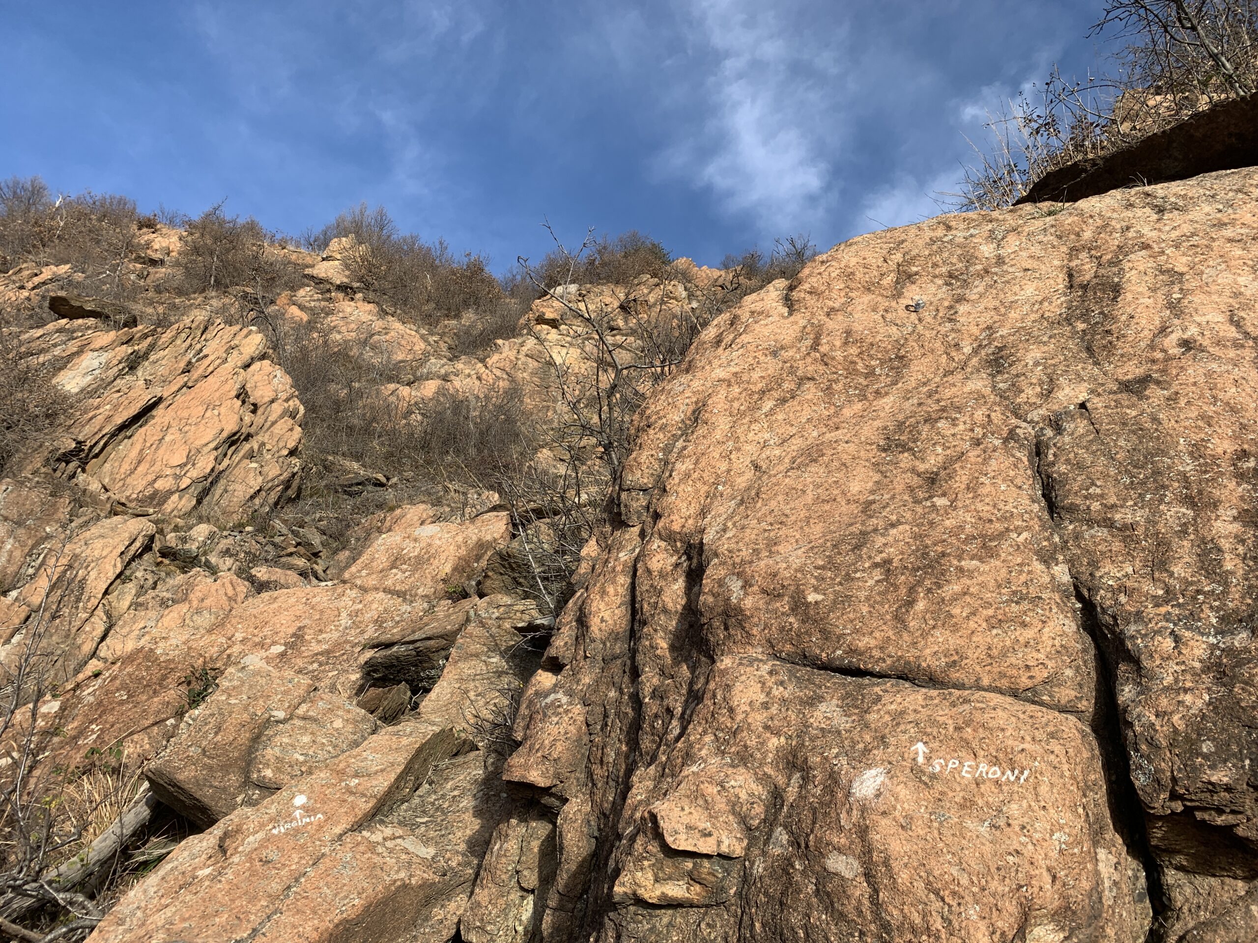La segnaletica ora indica di scendere lungo la pietraia per 5 min per attaccare lo sperone sinistro che porterà in vetta. Si può anche solo attraversarla per evitare la pur breve discesa riprendendo l’arrampicata a metà dello sperone dove, trà l’altro, ci sono i passaggi più interessanti, ma per completezza consiglio l’attacco alla base per non perdere il primo tiro su roccia stupenda (4°).