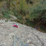 Per salita protetta corda da 30 sufficiente, 5/6 rinvii, 2/3 nuts/friends medi per integrare il fix di sosta dove presente, altre soste su cordone in clessidra o su tronco.