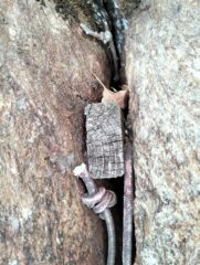 Verificata assenza di quasi tutte le piastrine nella parte bassa dell’itinerario. Buone possibilità di integrare con nut e friend medi e cordini.