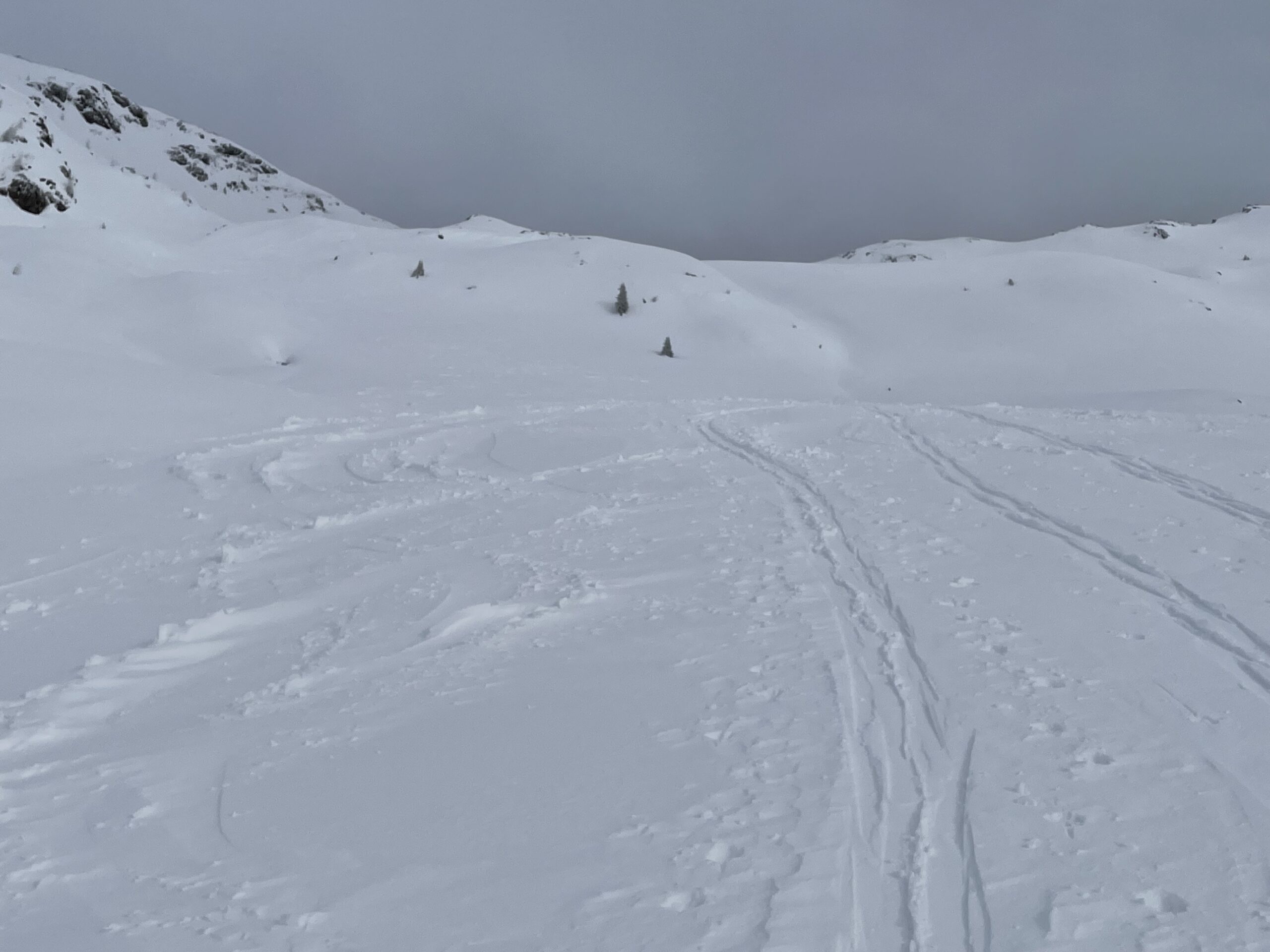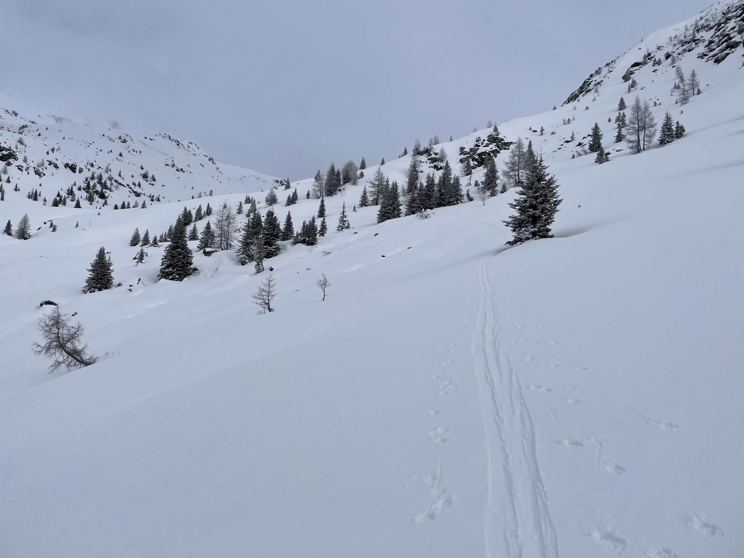 Si scende poi stando tutto a destra fino a 2100, dove con altra ripellata seguendo intuitivamente un pendio meno ripido verso Ovest si sale al Am Joch a 2400. Discesa per la salita e congiunzione con la salita al Mutennhock.