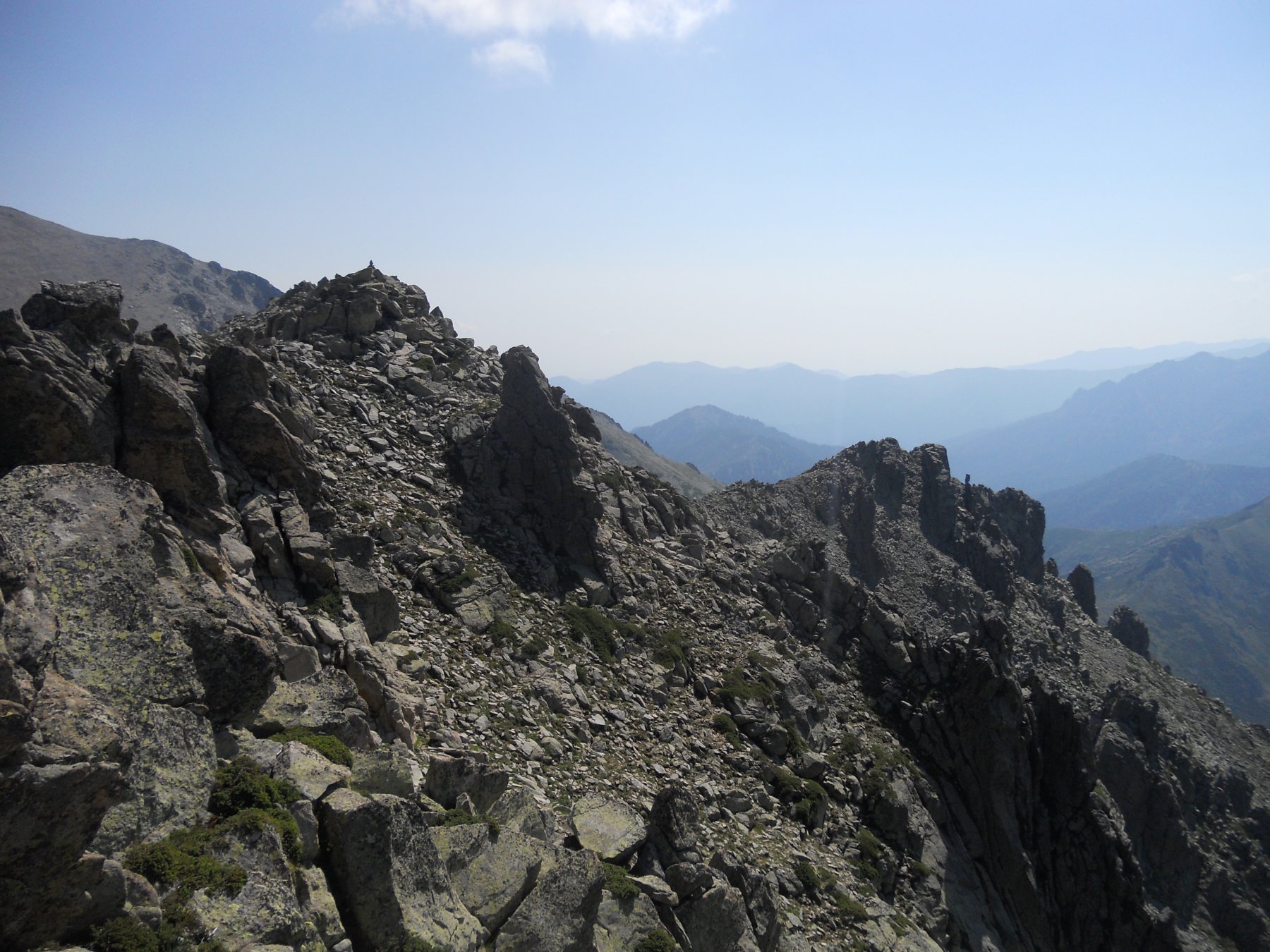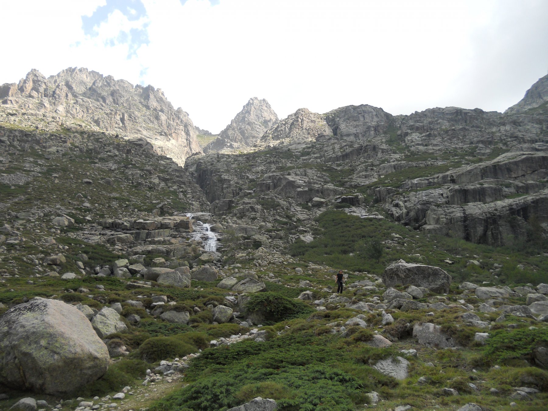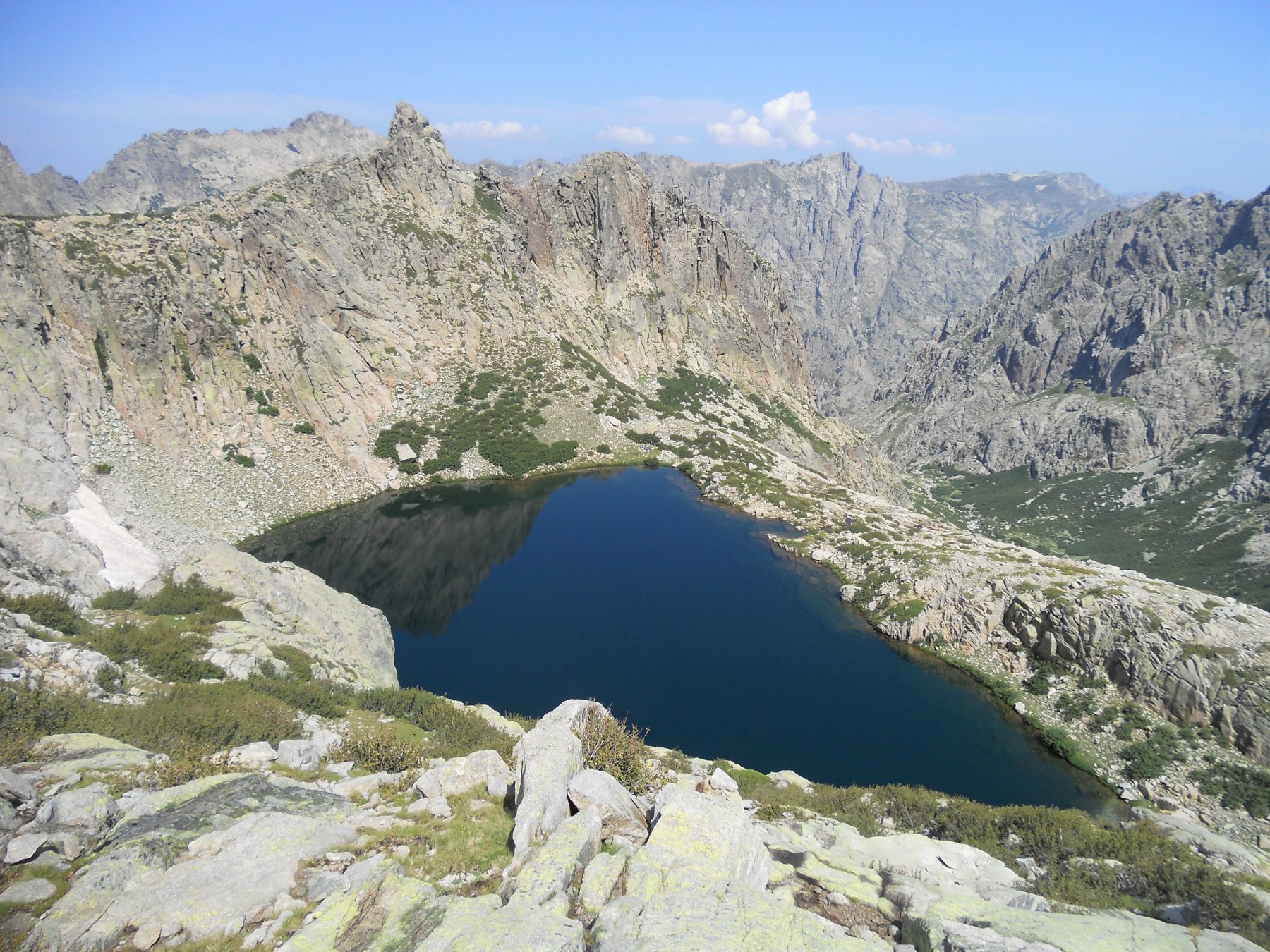 Il tratto alpinistico è esclusivamente riferito alla discesa dove sotto il lago Rinoso non si incontrano tracce e ci sono tratti esposti. Si percorre lo sperone appena salito fino ad una netta breccia nei pressi del lago di Rinoso, cui si scende per un canalino e successive comode cengie. Attraversato il Gr20 si arriva al lago da cui si inizia a scendere verso valle per ripide placche rocciose che paiono lasciate da antichi ghiacciai. Alla fine delle placconate un tratto di una cinquantina di metri di dislivello costringe a disarrampicare lungo la sinistra orografica del torrente che discende dal lago. La roccia è rugosa e ricca di appigli, comunque esposizione e tratti umidi invitano all’attenzione. Un salto di un paio di metri verso la fine si evita per una cengia a sinistra, poi meglio passare il torrrente e scendere gli ultimi saltini sul meno umido lato destro. Raggiunta la fitta vegetazione si punta al ruscello principale che scende dal col Rinoso, lungo il quale scorre l’unico tratto netto e ben visibile di sentiero. Appena il sentiero inizia a scendere deciso verso il fondovalle Restonica le tracce si perdono e occorre guadare il torrente dove possibile per portarsi sulla sinistra idrografica, piccolo ometto come riferimento. Da qui il più è fatto e la traccia anche se esile rimane visibile e conduce per ripidi canalini e evitando salti rocciosi già a valle della bergerie de Melo, ormai a meno di mezzora dal parcheggio.
