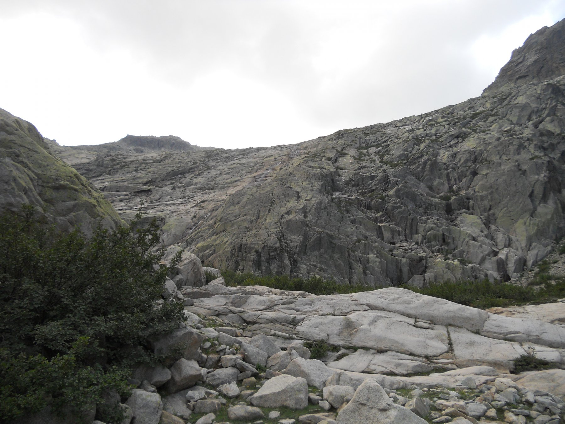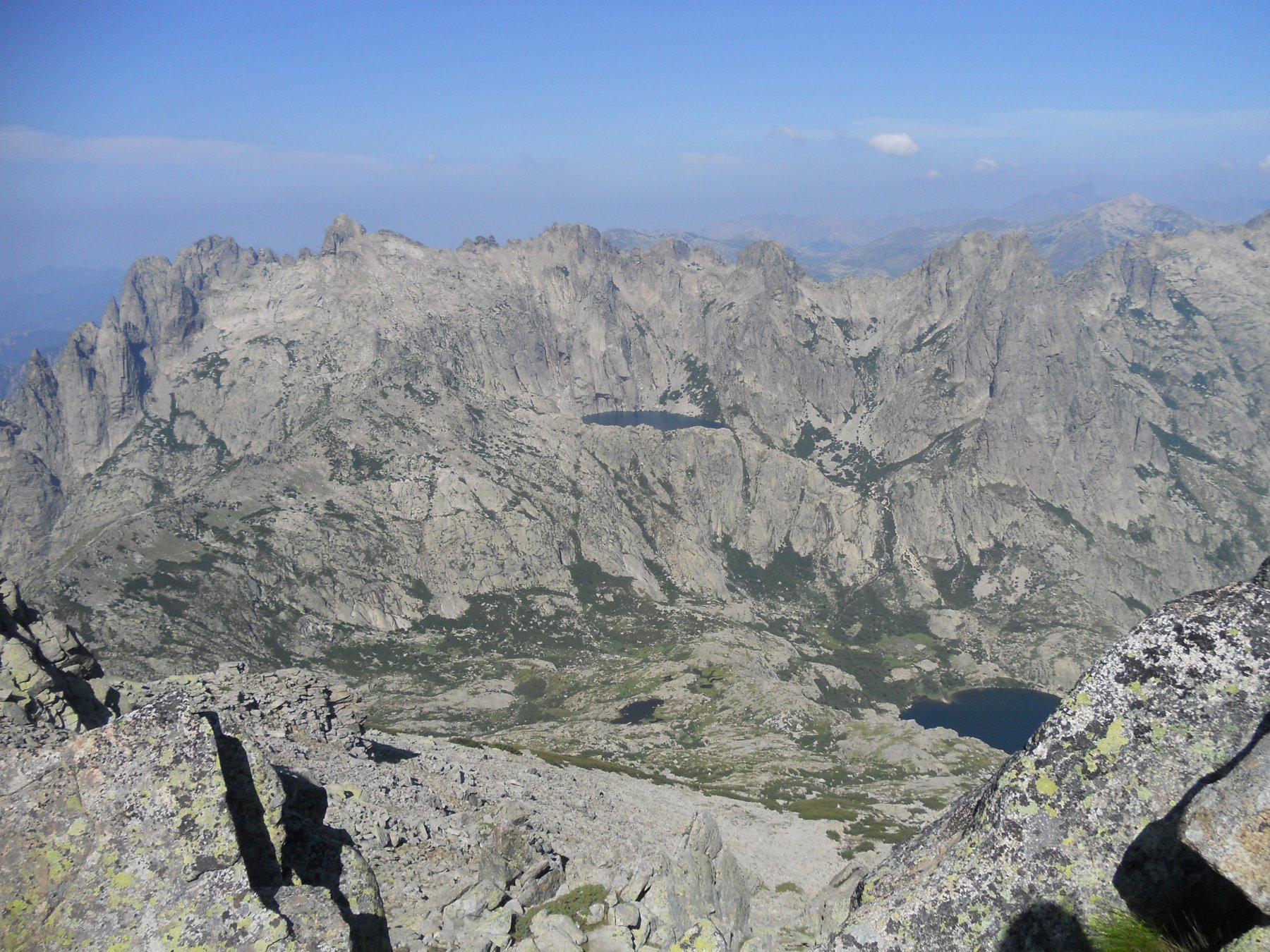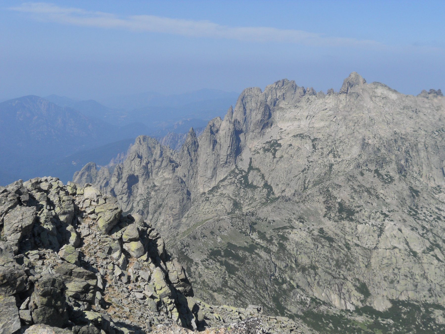 Il tratto alpinistico è esclusivamente riferito alla discesa dove sotto il lago Rinoso non si incontrano tracce e ci sono tratti esposti. Si percorre lo sperone appena salito fino ad una netta breccia nei pressi del lago di Rinoso, cui si scende per un canalino e successive comode cengie. Attraversato il Gr20 si arriva al lago da cui si inizia a scendere verso valle per ripide placche rocciose che paiono lasciate da antichi ghiacciai. Alla fine delle placconate un tratto di una cinquantina di metri di dislivello costringe a disarrampicare lungo la sinistra orografica del torrente che discende dal lago. La roccia è rugosa e ricca di appigli, comunque esposizione e tratti umidi invitano all’attenzione. Un salto di un paio di metri verso la fine si evita per una cengia a sinistra, poi meglio passare il torrrente e scendere gli ultimi saltini sul meno umido lato destro. Raggiunta la fitta vegetazione si punta al ruscello principale che scende dal col Rinoso, lungo il quale scorre l’unico tratto netto e ben visibile di sentiero. Appena il sentiero inizia a scendere deciso verso il fondovalle Restonica le tracce si perdono e occorre guadare il torrente dove possibile per portarsi sulla sinistra idrografica, piccolo ometto come riferimento. Da qui il più è fatto e la traccia anche se esile rimane visibile e conduce per ripidi canalini e evitando salti rocciosi già a valle della bergerie de Melo, ormai a meno di mezzora dal parcheggio.
