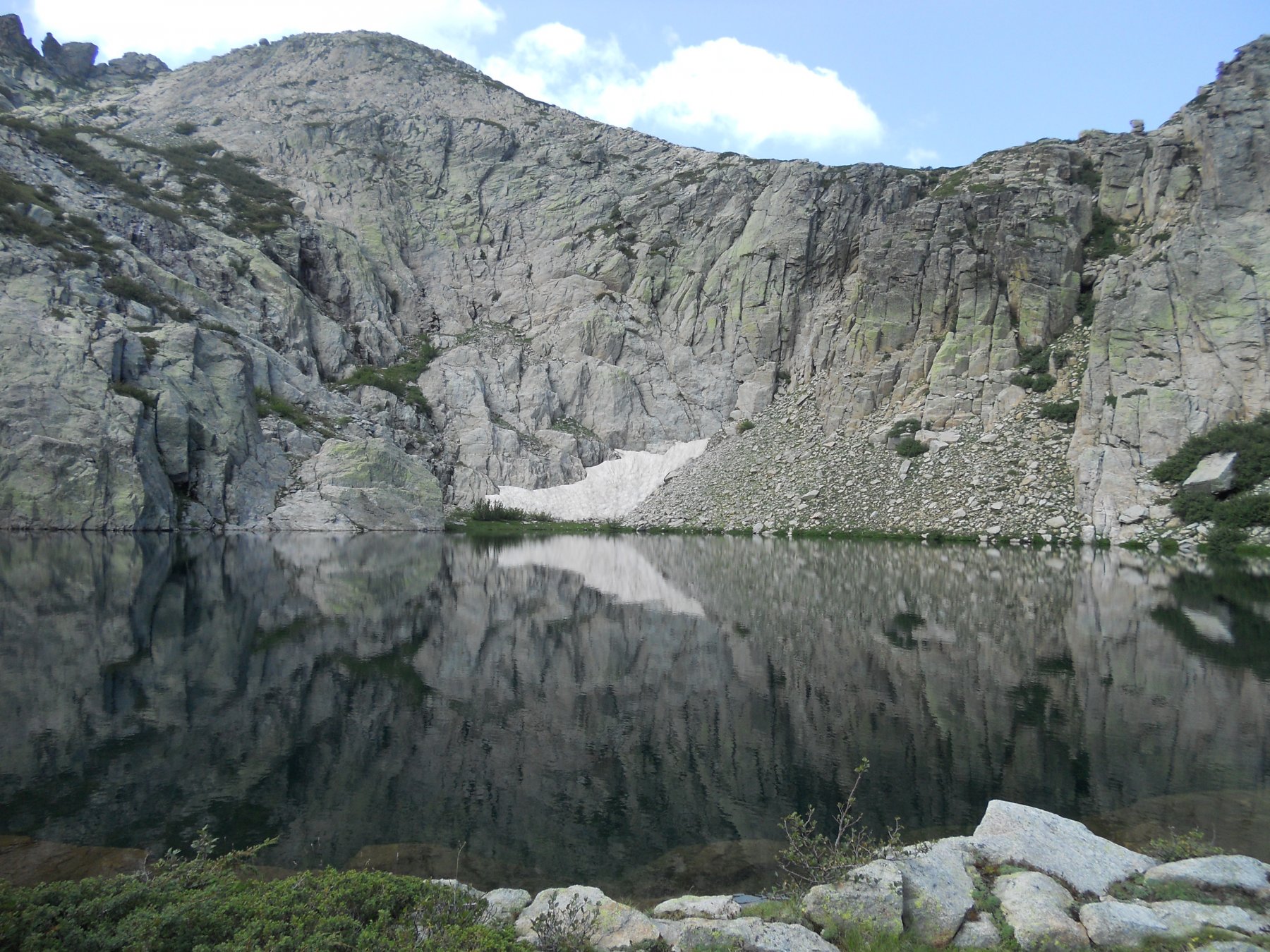 Dal parcheggio di fondovalle (pochi posti, meglio arrivare non oltre le 8) si raggiunge il Lac de Melo in circa un’ora per ripido sentiero facilitato da catene e una scaletta nei pressi del lago. La traccia principale prosegue a destra verso il lac de Capitello sostenuto da una bastionata rocciosa, ma si prosegue dritto per pascoli seguendo bolli gialli. Per rocce montonate e tratti di densa vegetazione si sbuca alla Bocca di Soglia incrociando il GR20. Si prosegue a sinistra sul GR20 che traversa alto sul vallone percorso portandosi verso il colle Rinoso. Usciti dalla vegetazione si raggiunge un netto sperone roccioso che divide il versante Melo dal Vallone di Rinoso, per vaghe tracce di animali seguire a destra lo sperone percorrendone il filo, tratto di salita ripido e molto panoramico. Nei pressi dello spartiacque si sbuca su un ripiano ed un canalino detritico consente di portarsi in cresta,. Per facili roccette verso sinistra con splendidi scorci sui dirupi lato sud ci si porta all’ometto di vetta. La traversata diretta per cresta verso il col Rinoso ed il GR20 appare fattibile in assetto escursionistico.