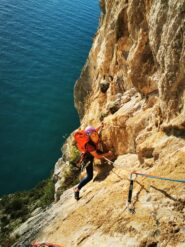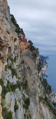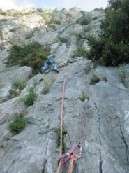 - L5: 3a – per corda fissa si attraversa una breve fascia terrosa, poi facilmente a sx (20m).