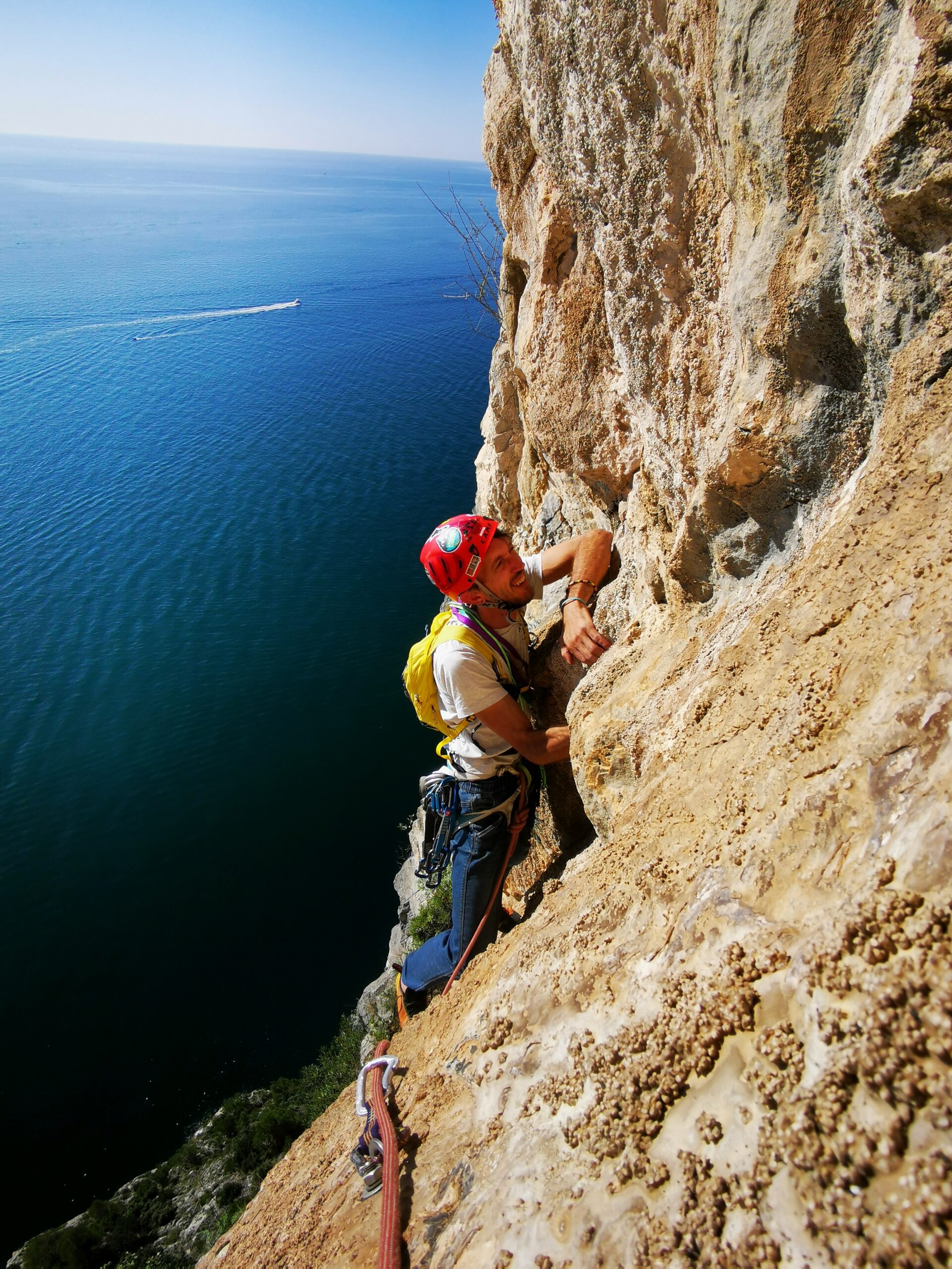 - L2: 6a+ – muro iniziale difficile, di dita, poi placca tecnica e difficile ribaltamento a sx su breve tettino/spigolo (40m).