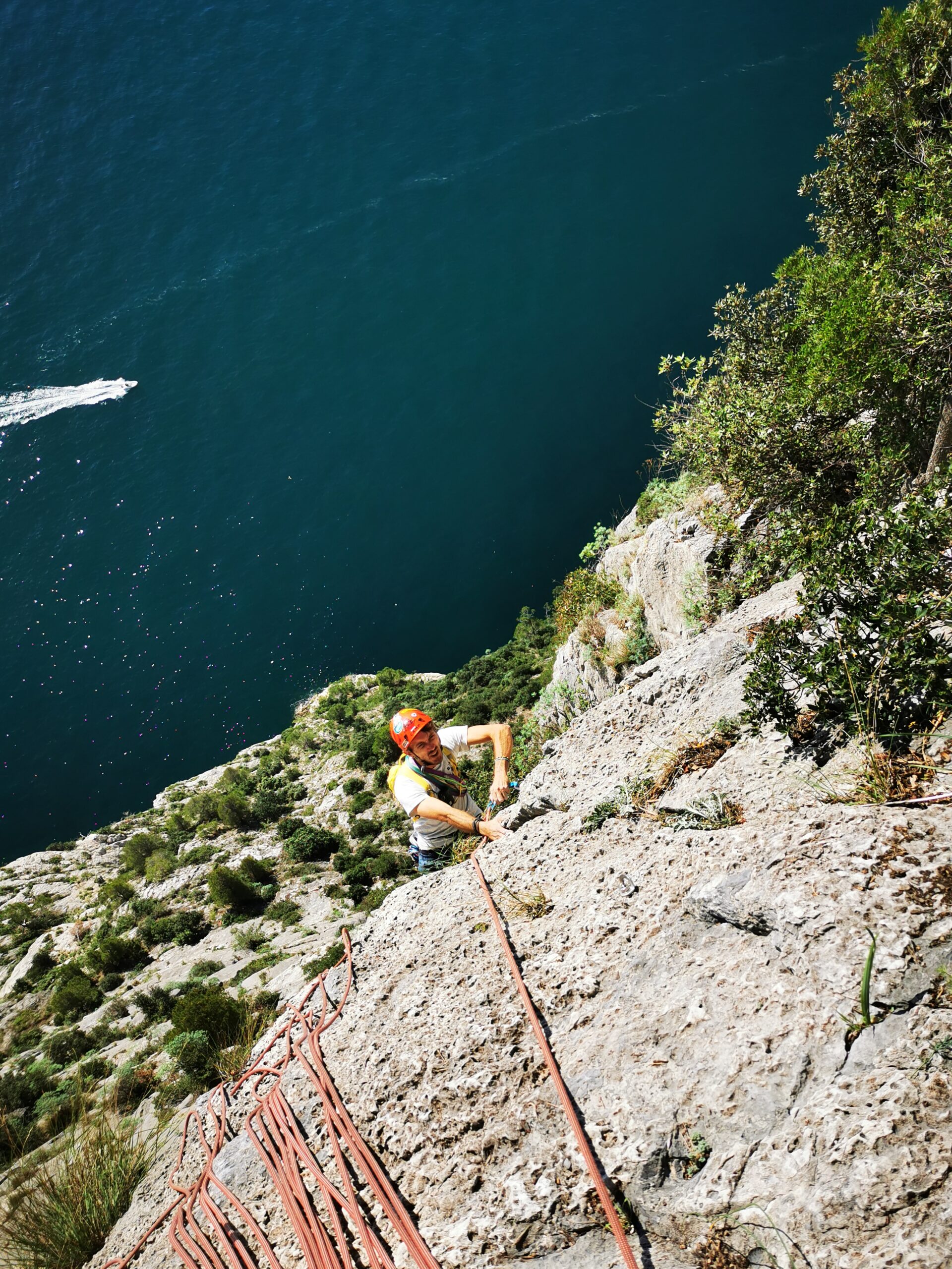 Materiale: è consigliabile adoperare due mezze corde da 60m (14 rinvii). La via è ben protetta.