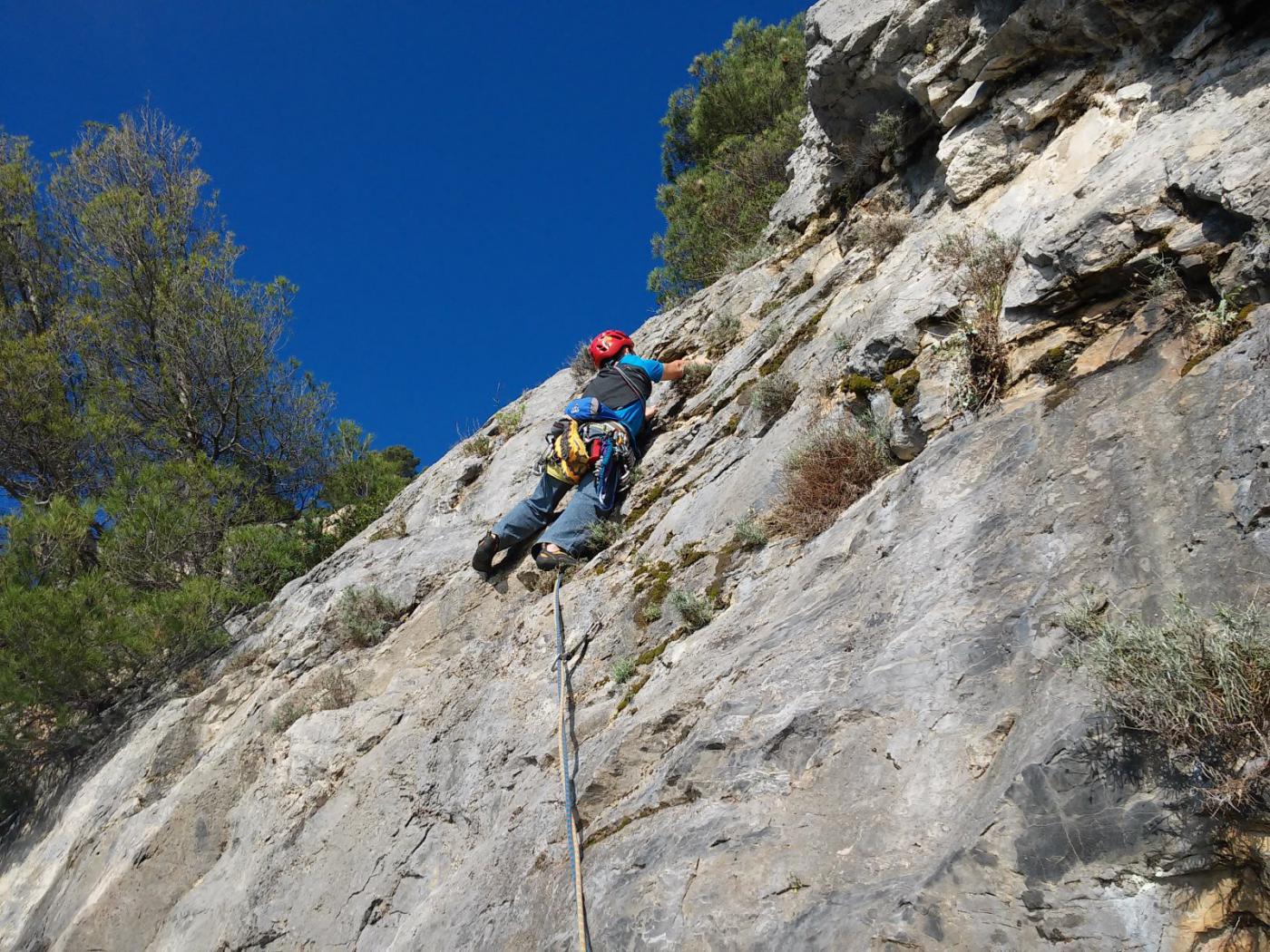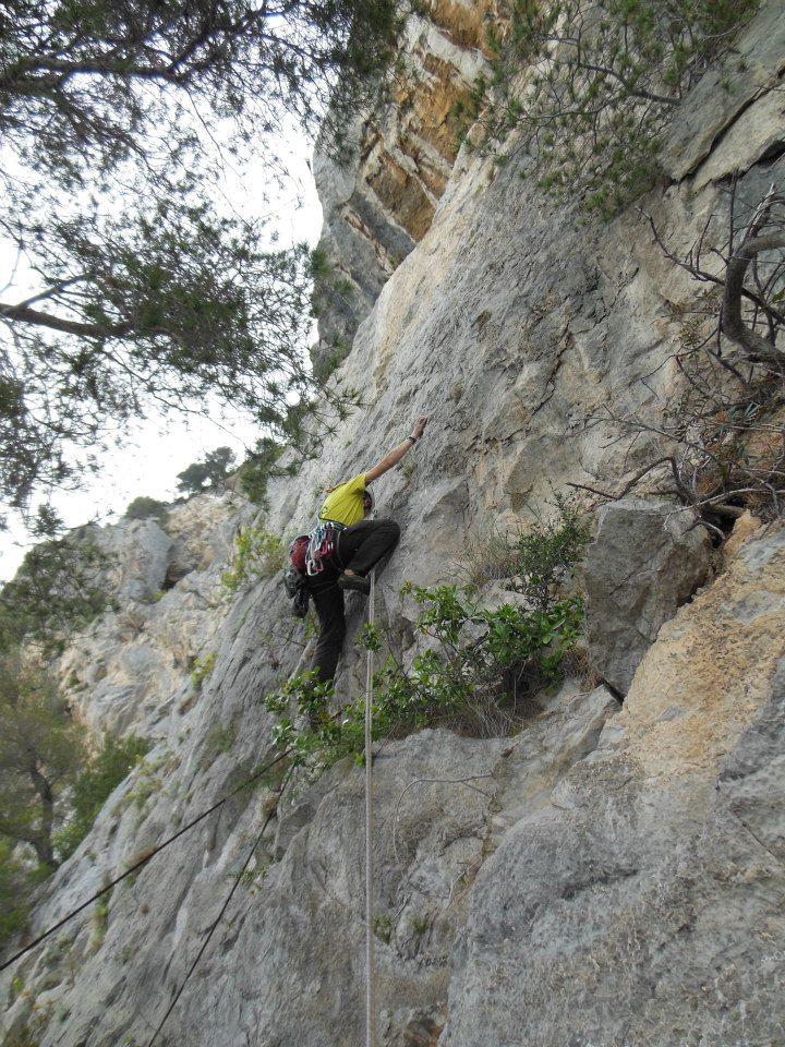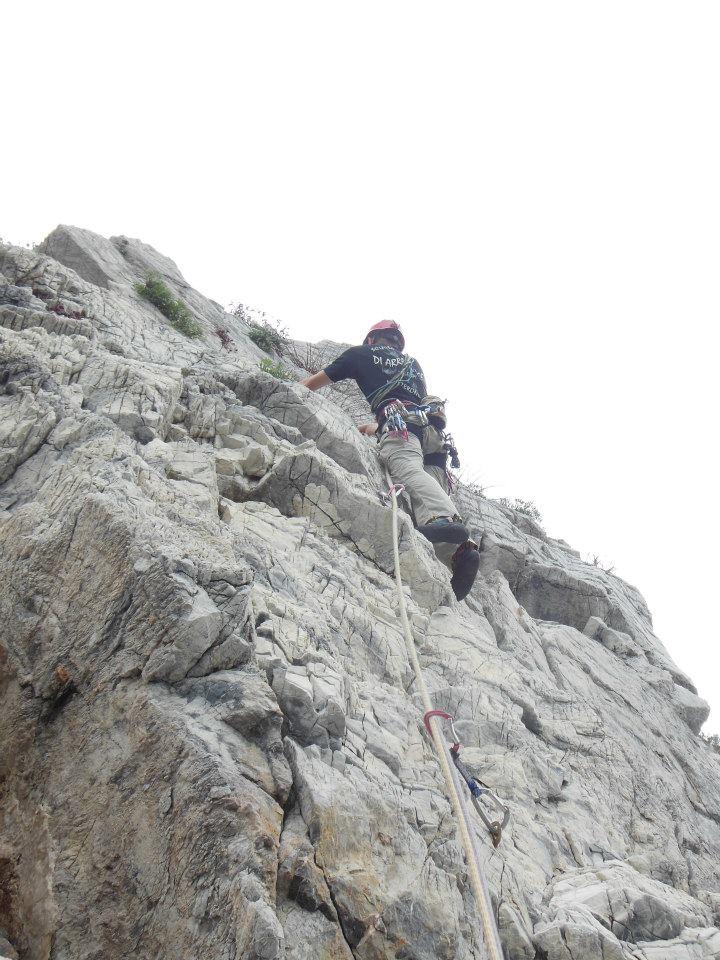 - L2: 6b /6b+, 60m, placca verticale a tacche, e poi brevi paretine (saltate due soste intermedie e fatta sosta su vecchio e grosso pino su cengia)