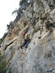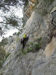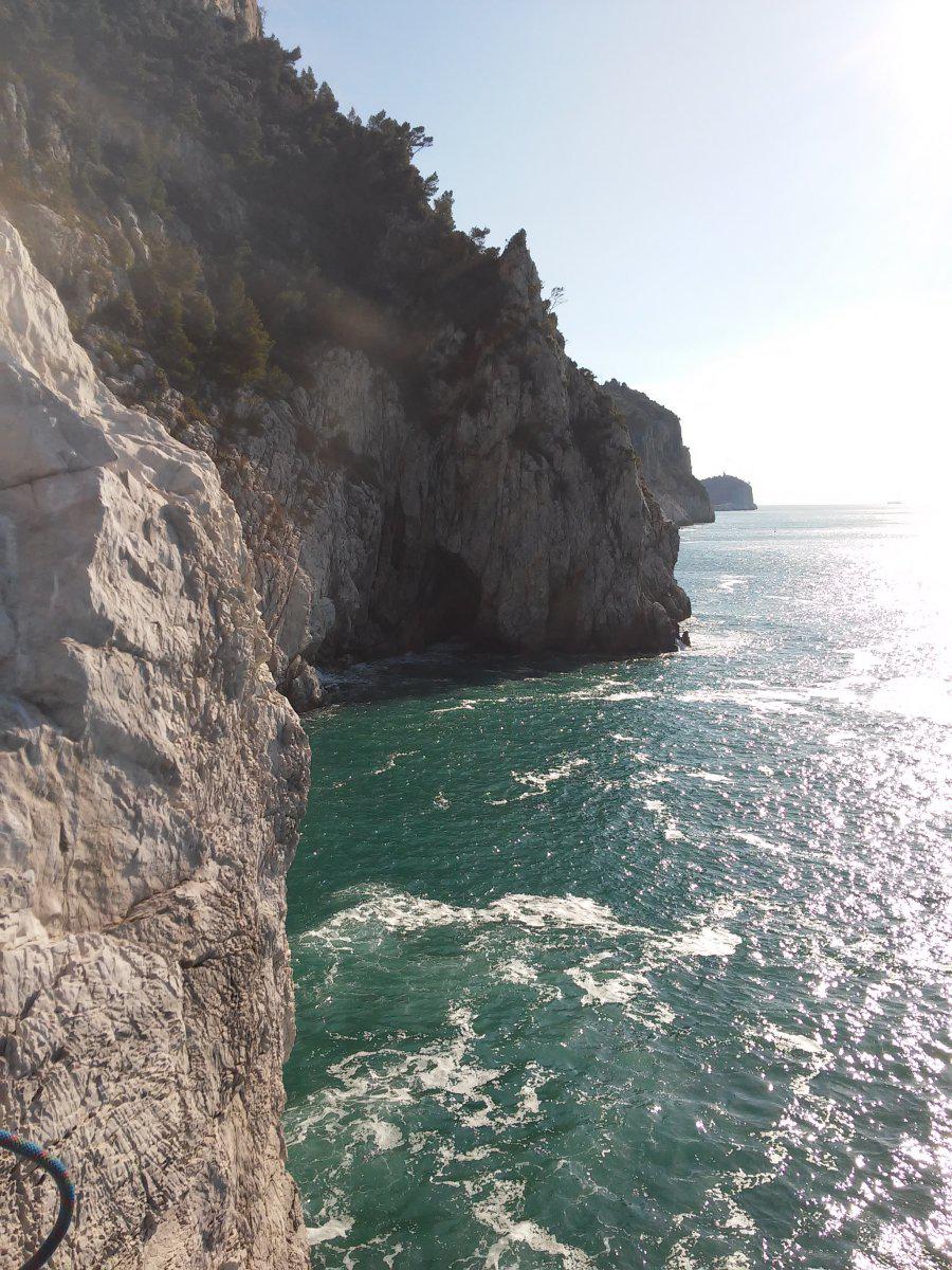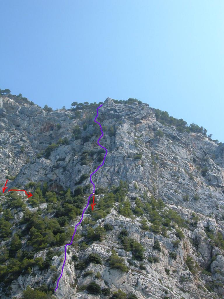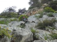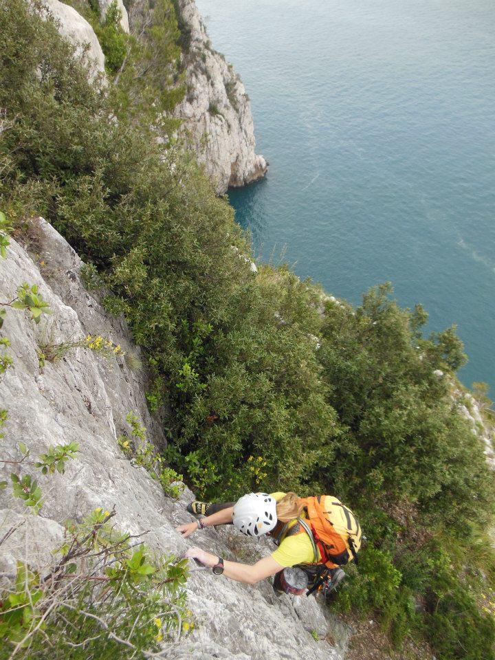 Da qui, per tracce poco marcate, si prosegue verso sinistra, guardando il mare, attraversando un boschetto intricato (circa 60-70m), giungendo così ad una sosta della via con catena inox.