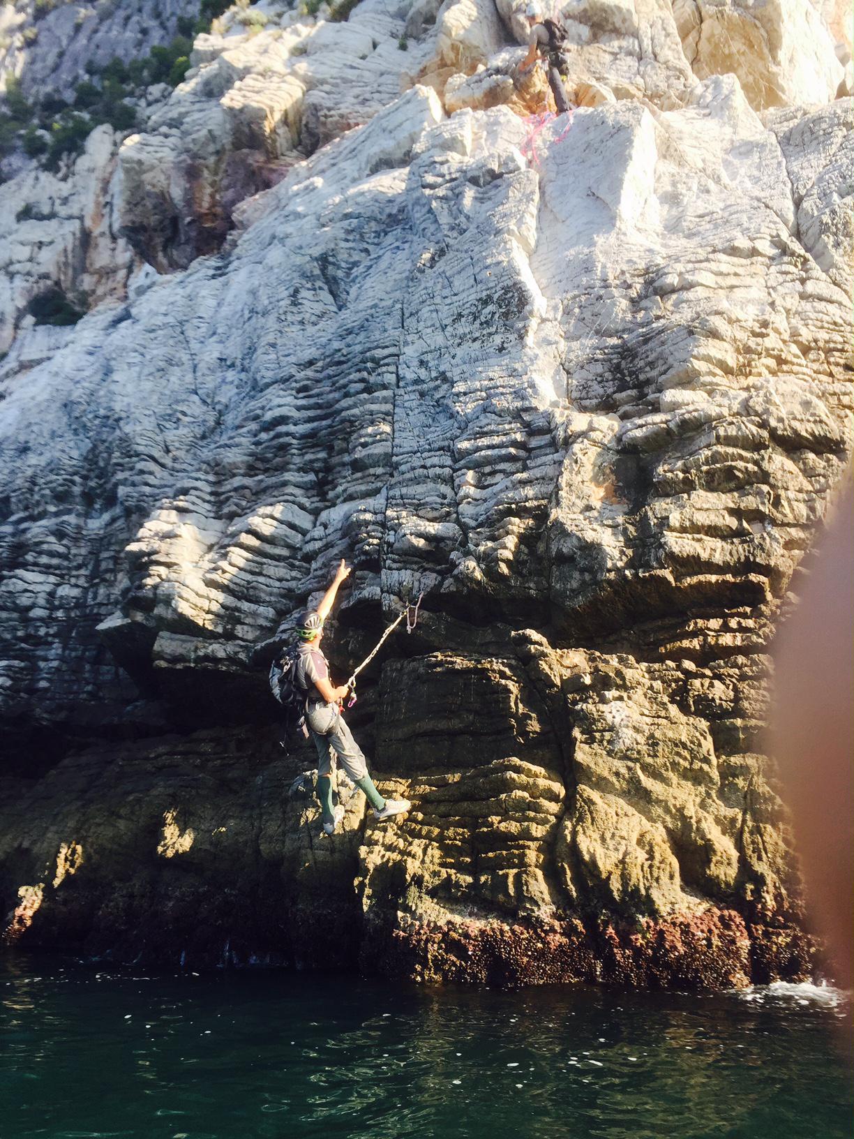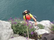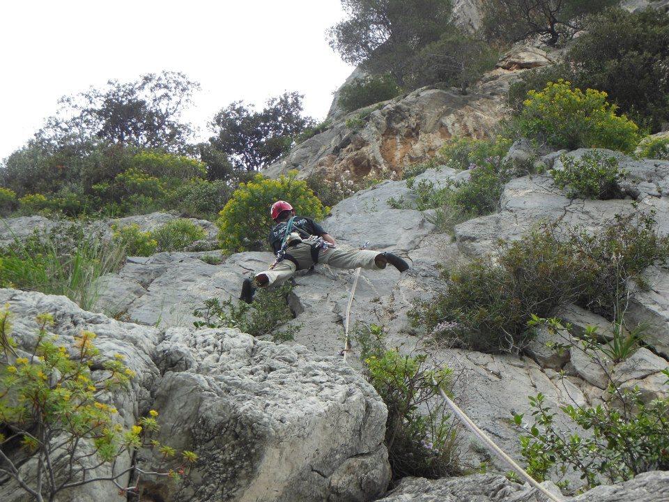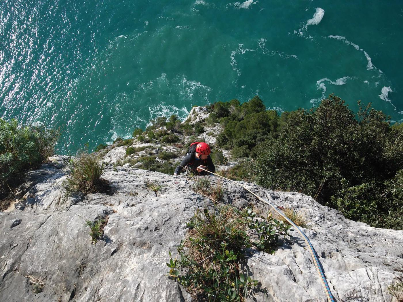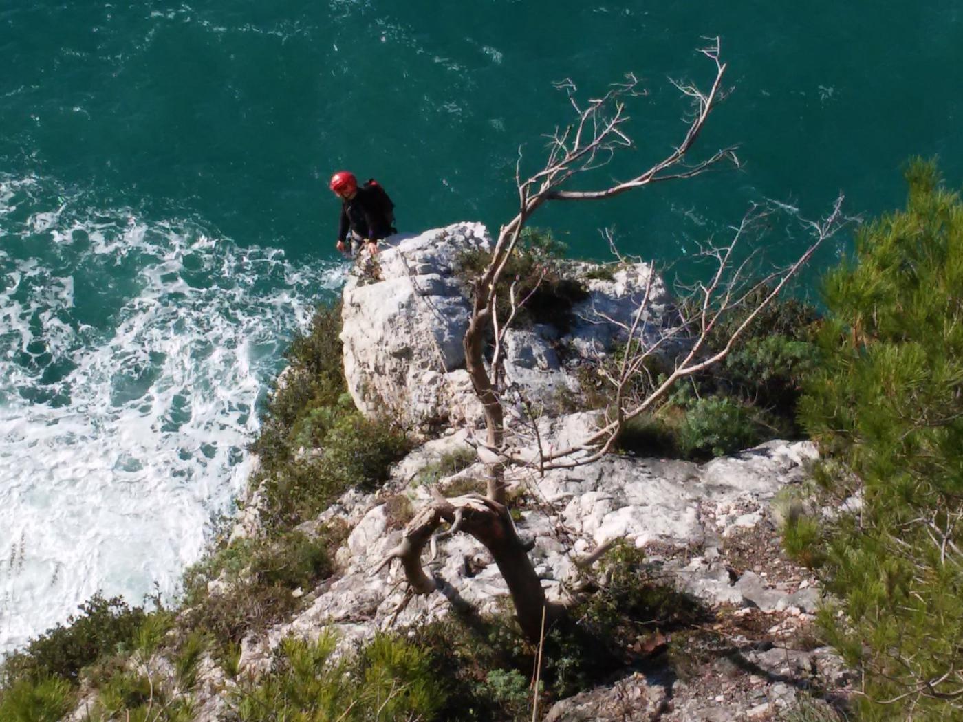 Con 4 doppie si raggiunge l’inizio della via a due passi dal mare (attenzione a non far terminare le corde in acqua).