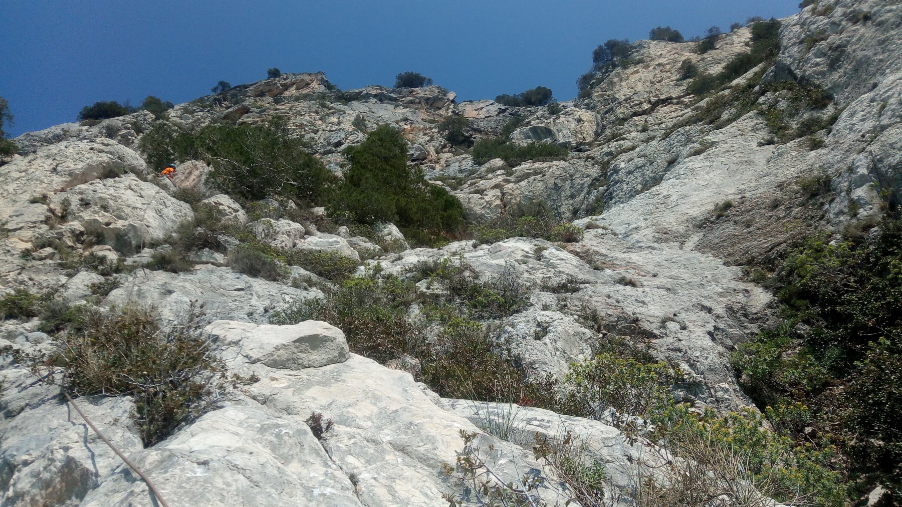 Proseguire fino ad incontrare l'anfiteatro del settore Mandrachia alta: avanzare fino a una vecchia corda fissa utile per superare un muro. Costeggiare il medesimo verso il mare. Sosta attrezzata a spit inox (dal sentiero 1a 4 minuti).
