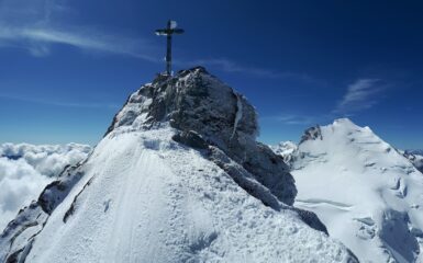 Si capisce che la traversata rimarrà un’utopia. Arriviamo in cima la Nadelhorn in 7 ore. Le parti rocciose sono tutte ricoperte da fiori di ghiaccio e negli ultimi metri bisogna stare molto accorti.
