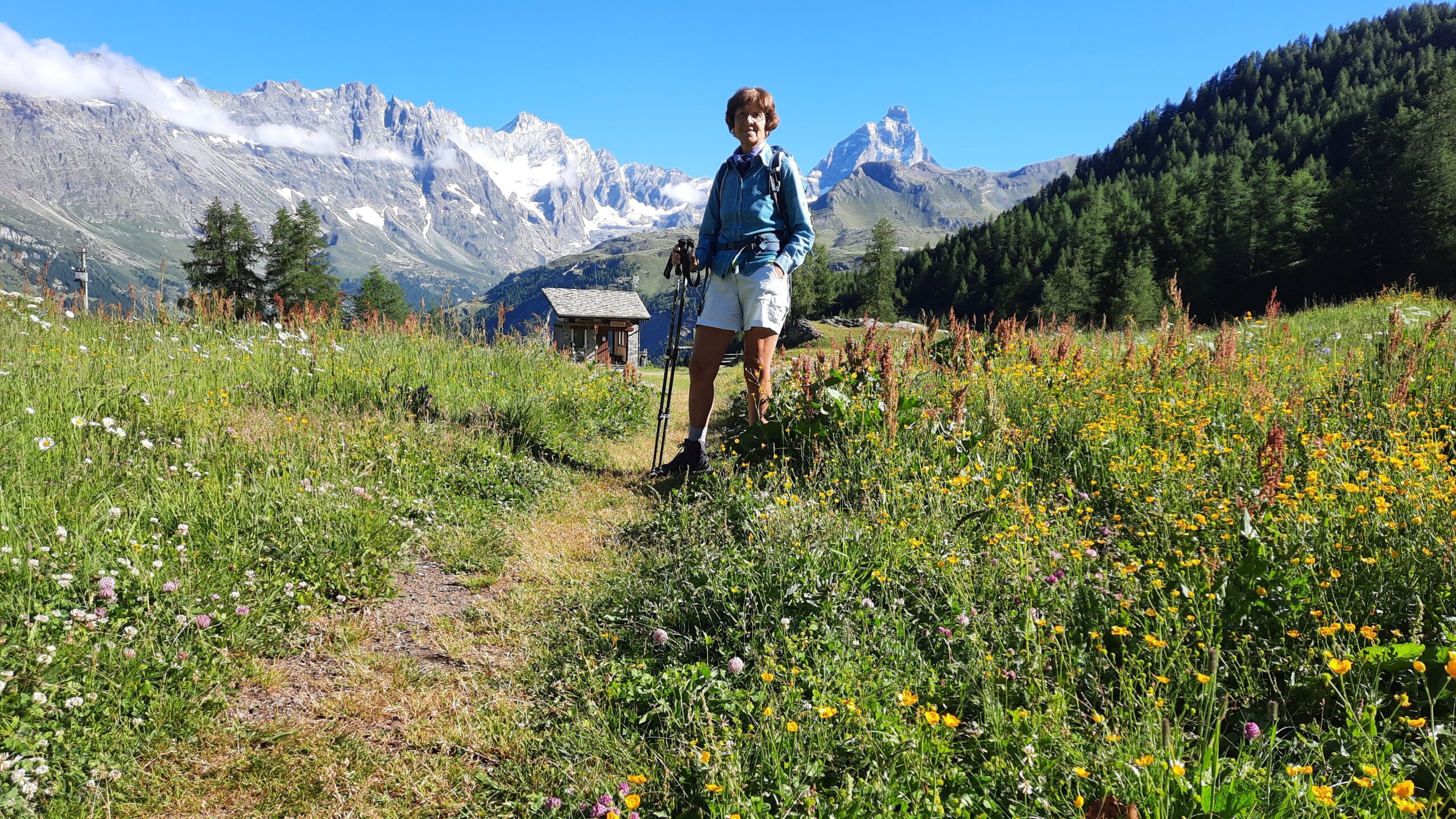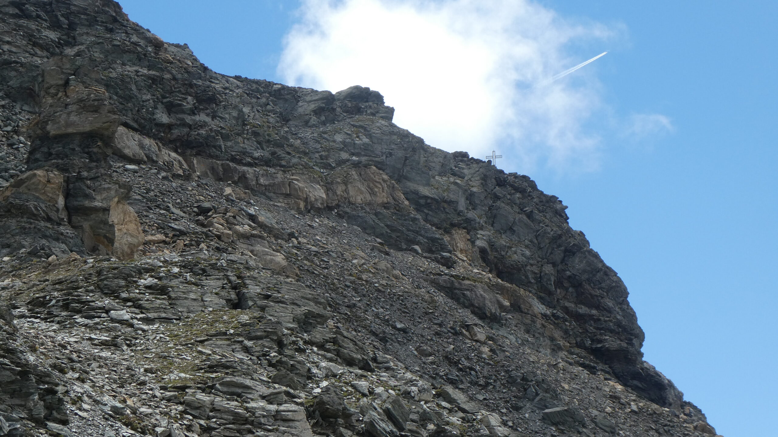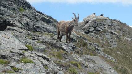 La salita da Cheneil per il colle di Nana alla vetta è varia e divertente, decisamente più interessante che dalla valle d’Ayas, percorsa qualche anno fa. La traccia è sempre abbastanza evidente, con tratti di cresta, traversi con alcuni tratti un po’ esposti e ogni tanto qualche tratto un po’ verticale. L’ultimo risalto sotto la vetta è attrezzato con 3 brevi pezzi di catena, di cui uno solo risulta utile. Dapprima sereno, sono comparse poi velature. In cima diverse persone, la maggioranza salite dalla valle di Ayas. Sul crestone della vetta si aggirava un simpatico stambecco, quasi domestico…