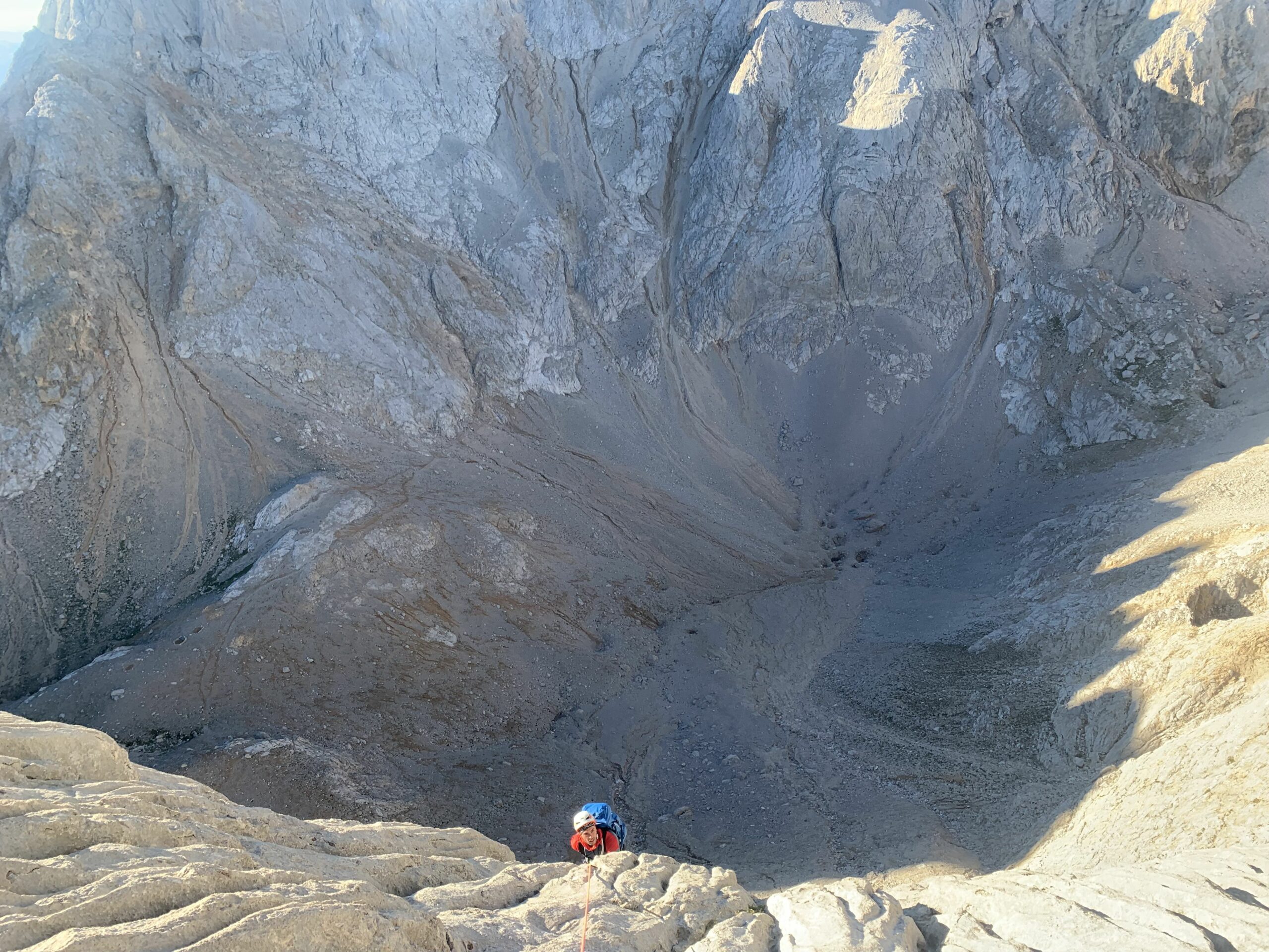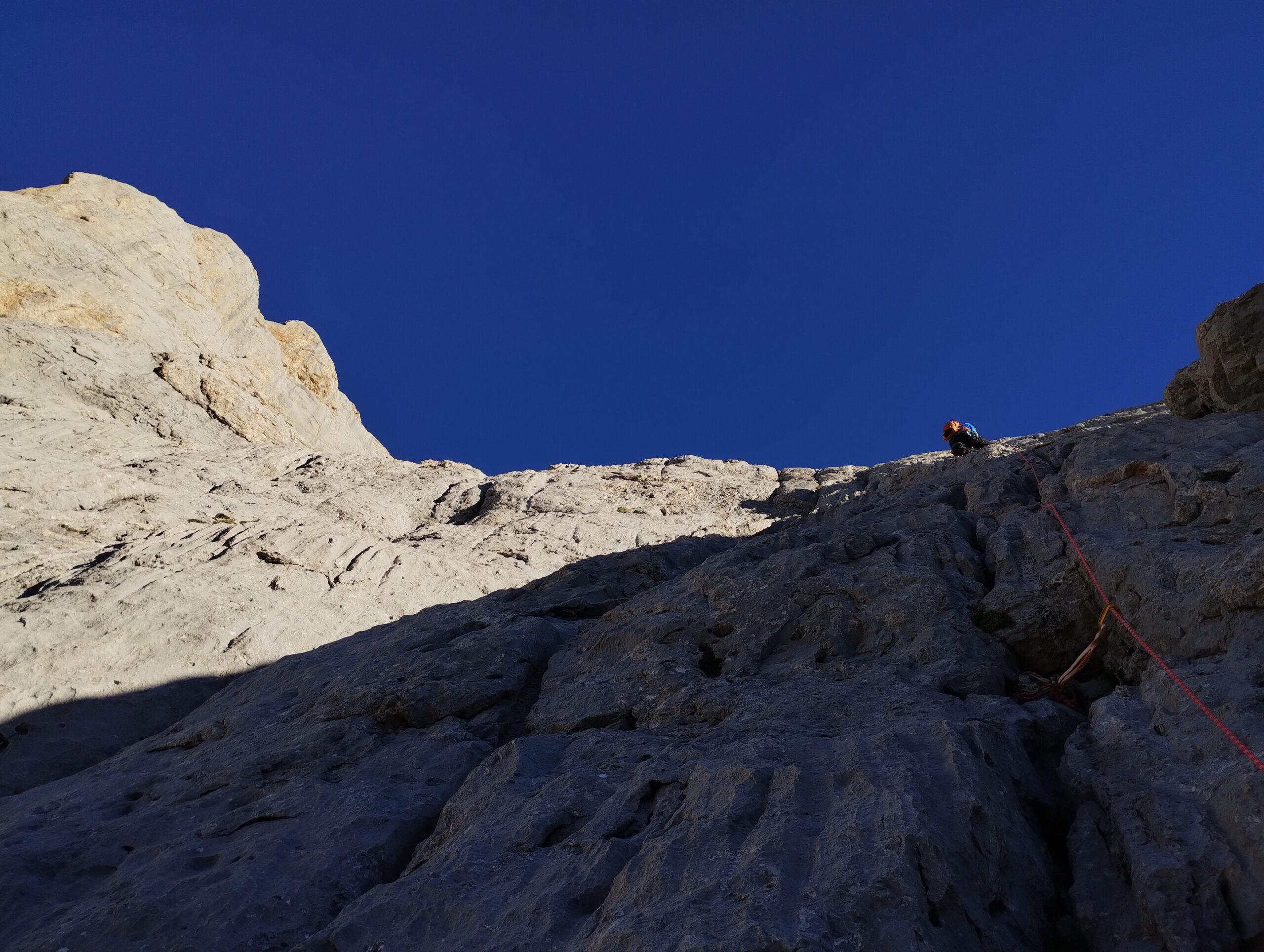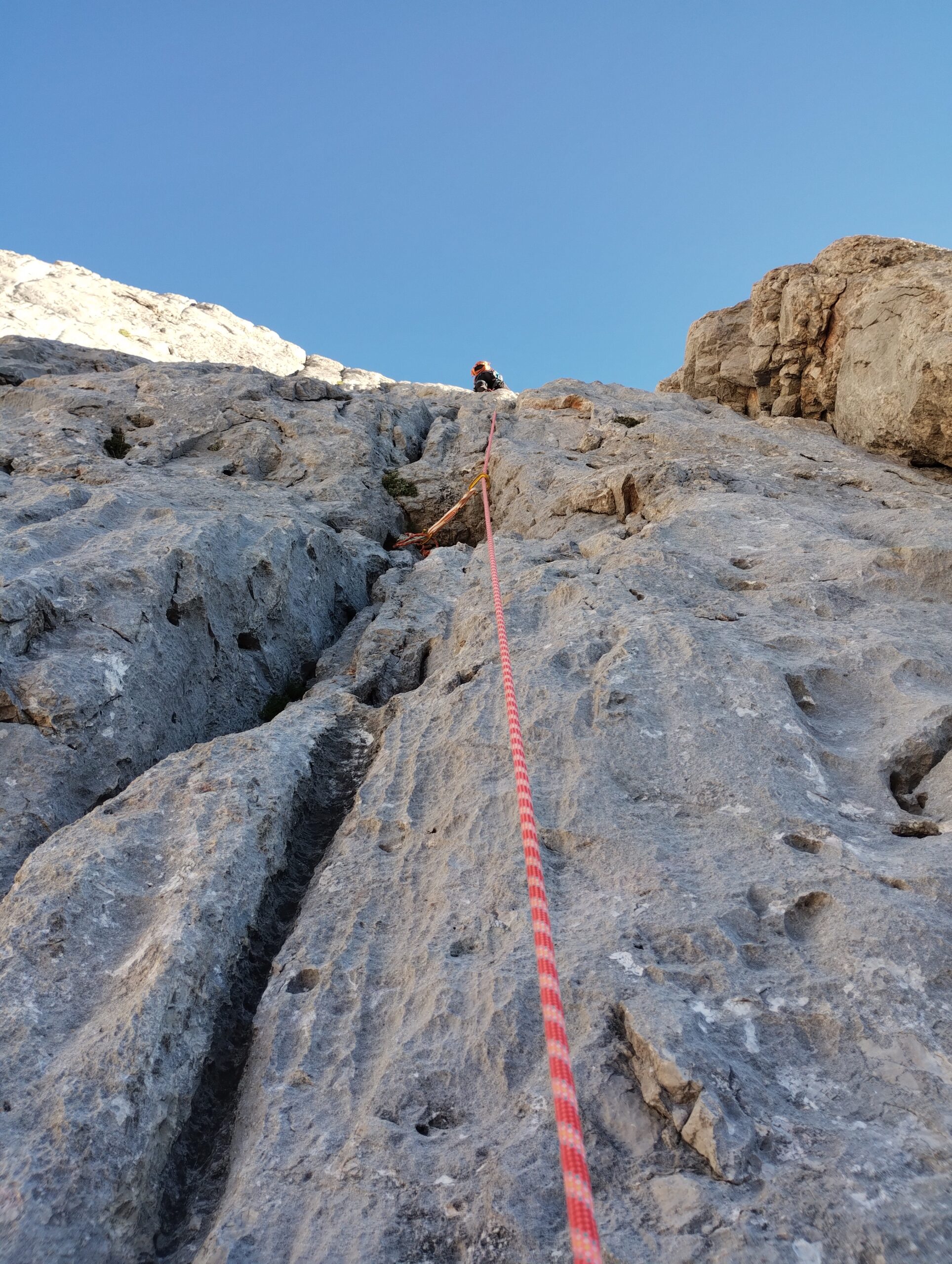 - L5, 30m, III+: qui la parete si abbatte e si entra nell’anfiteatro. Tiro simile a L4 ma molto più abbattuto. Sosta comoda su placca semi pianeggiante.