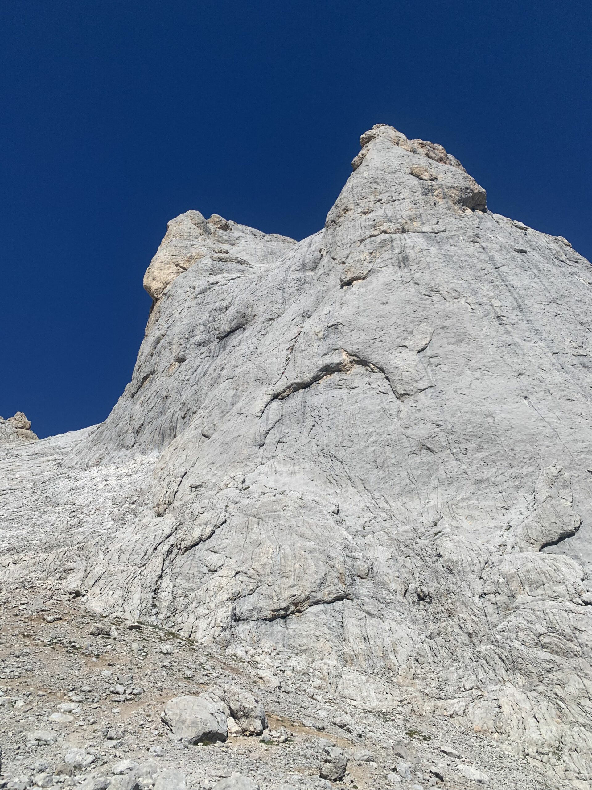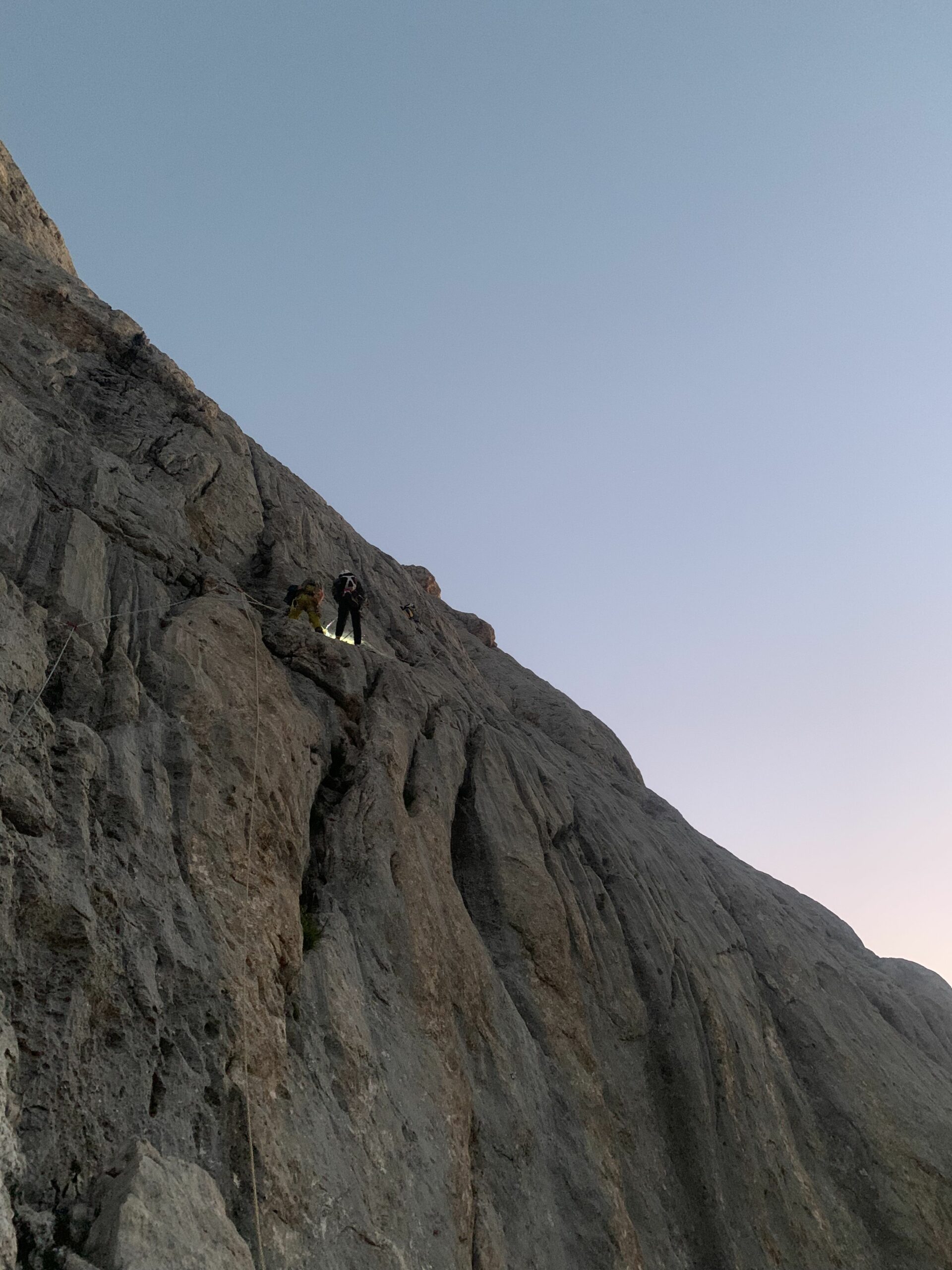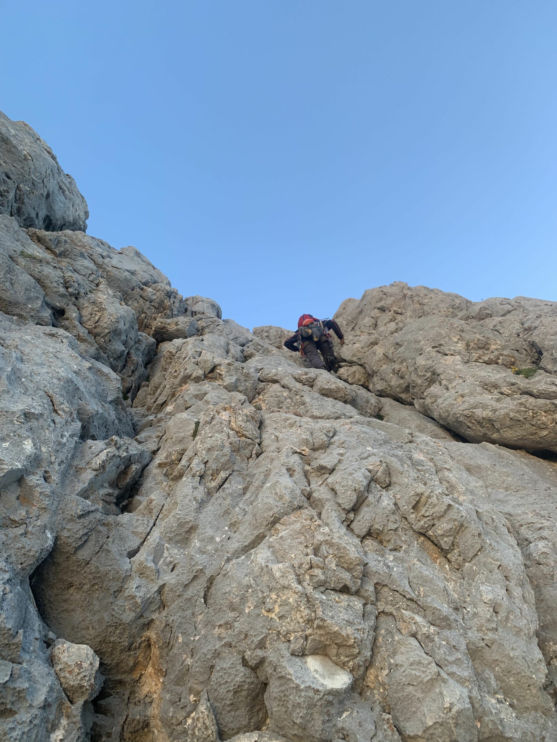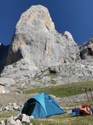 - L5, 30m, III+: qui la parete si abbatte e si entra nell’anfiteatro. Tiro simile a L4 ma molto più abbattuto. Sosta comoda su placca semi pianeggiante.