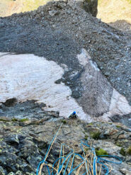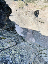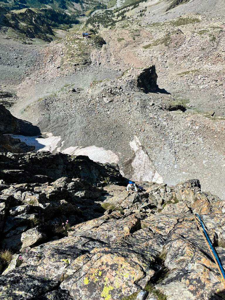 Se si arriva in vetta, la discesa consigliata è quella della via normale passando dal colle della Forchetta (EE/F, 45′ al rifugio, tacche rosse).