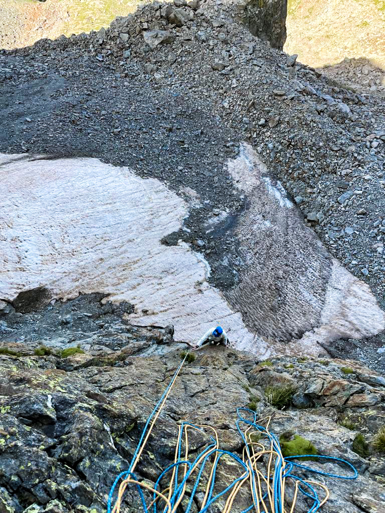 Arrivati sull’avancima (fine decimo tiro, sosta da attrezzare su spuntone) si traversa a dx fino ad una evidente forcella (cordone di sosta) e si affronta l’ultimo tiro dello spigolo Vernet (dx, chiodi e fettuccia gialla) o Strapiombi di Nasta (sx, spit blu), arrivando su uno sperone in vista della croce di vetta.