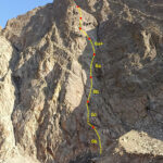 La via ha una lunghezza di dieci tiri (corde da 60m consigliate).