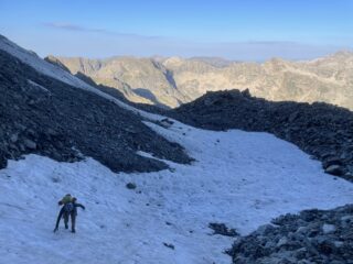 – parte alta: alpinistica sia per chiodatura che per tipologia di scalata. Con alpinistica intendo che spesso le soste sono con 1 chiodo e 1 piastrina e gli spit sui tiri sono 2/3 max. Diventa quindi consigliabile/ indispensabile portare materiale per integrare.