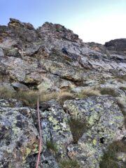 - L5: salire in diagonale a sinistra (ometto), traversando dopo 30 m a sinistra verso lo sperone che sale parallelo (50 m, 3a, sosta su 1 spit)