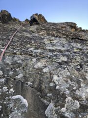 - L8: superare un breve strapiombo con buone prese, proseguire lungo bei muri di roccia rossa articolata (attenzione a qualche blocco instabile), fino a uscire in vetta (60 m, 5a, 2 spit e i friend incastrato, sosta su cordoni e spuntone).