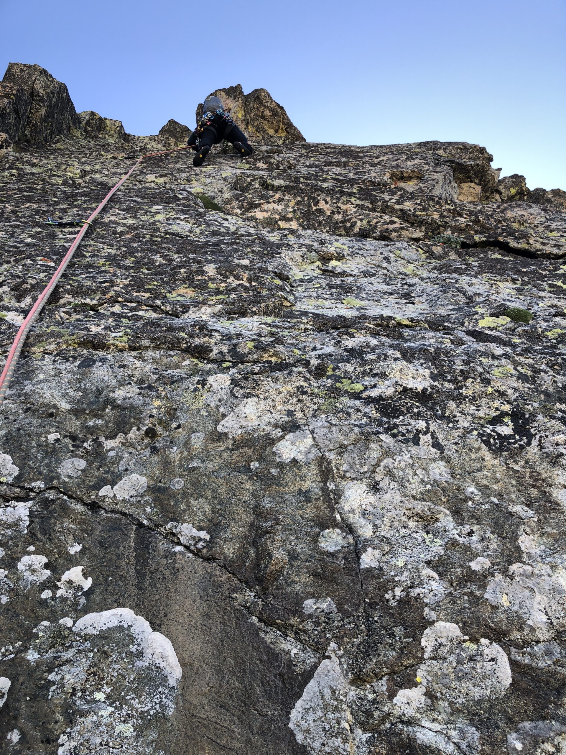 - L4: scalare la bellissima placca verticale, uscendo a destra per contornare lo strapiombo sommitale della torre, poi scalare una seconda splendida placca fino ad uscire in cima allo sperone (30 m, 6a, 5 spit, sosta su 2 spit)